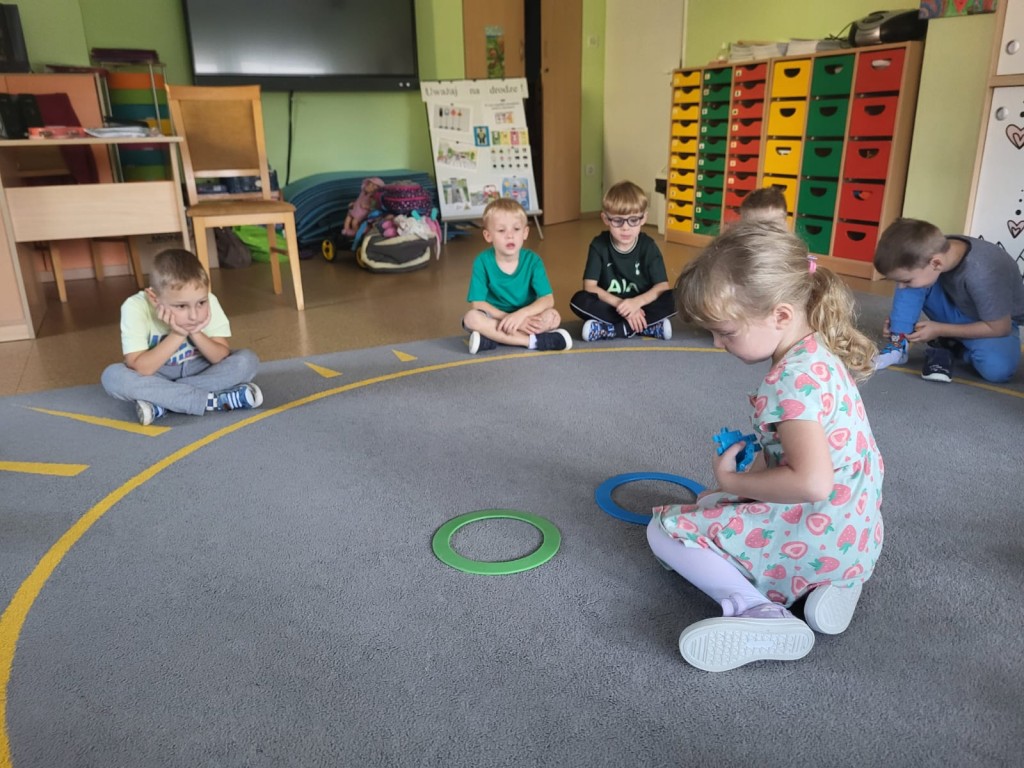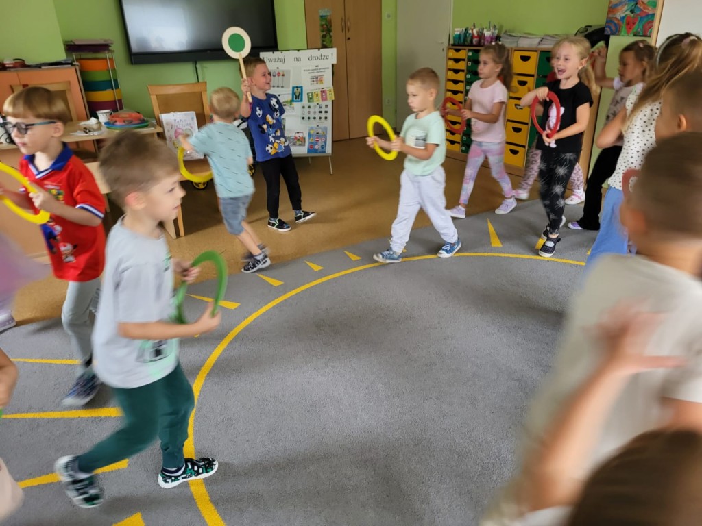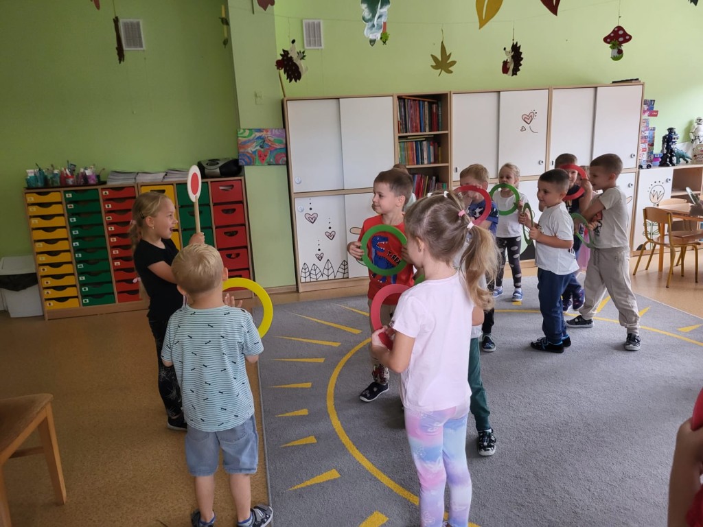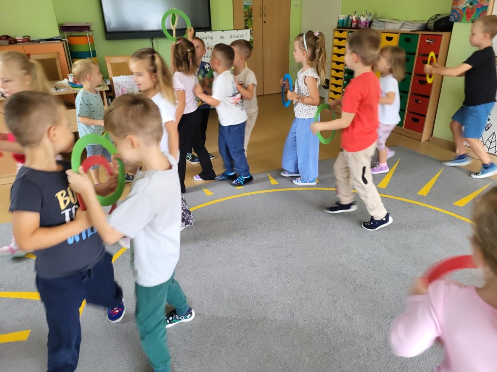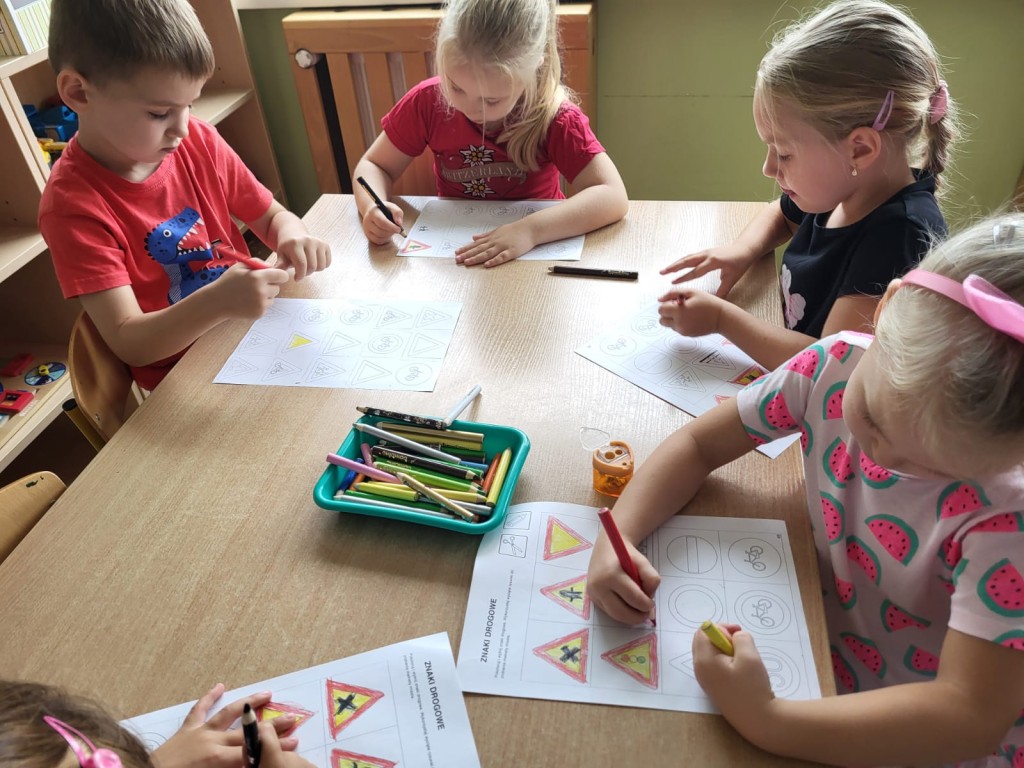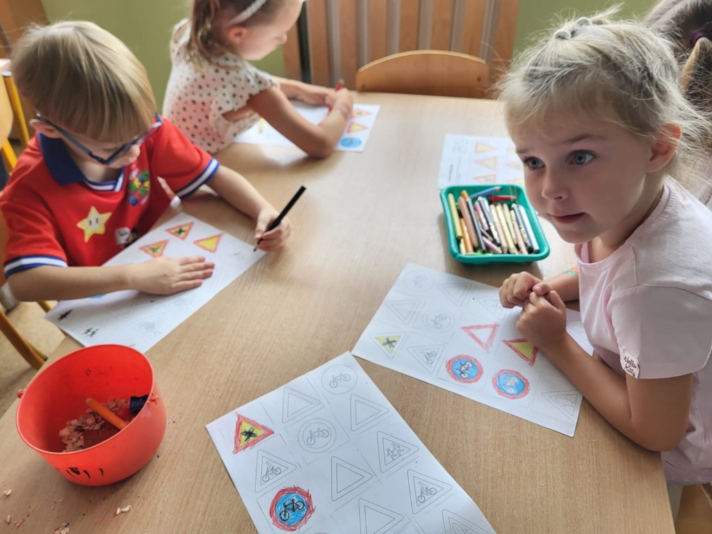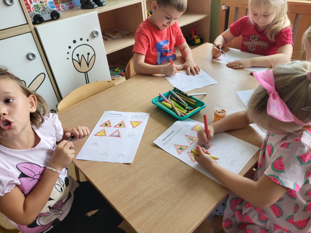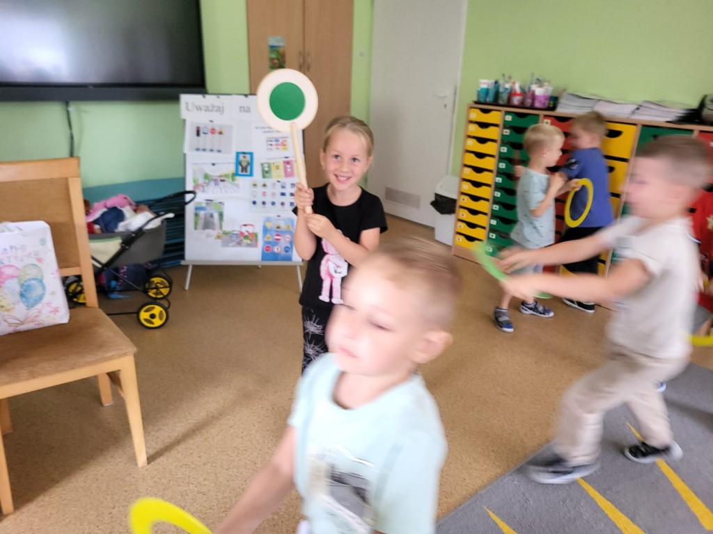 W minionym tygodniu dzieci poznawały zasady ruchu drogowego. Będąc na spacerze uczyły się, jak bezpiecznie poruszać się po drodze, wiedząc że zawsze przechodzimy przez jezdnię po pasach lub czekamy na zielone światło, a także uważamy na samochody, rowery i hulajnogi. Słoneczka utrwalały wiedzę poprzez zabawy ruchowe, historyjki obrazkowe i krótkie ćwiczenia praktyczne. Wykonały pracę plastyczną- ,,Sygnalizator świetlny”, kolorowały znaki drogowe. Poznawały cyfrę 0 ,wykorzystując części ciała oraz literkę O.