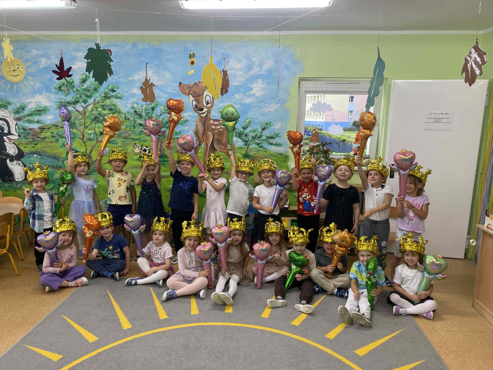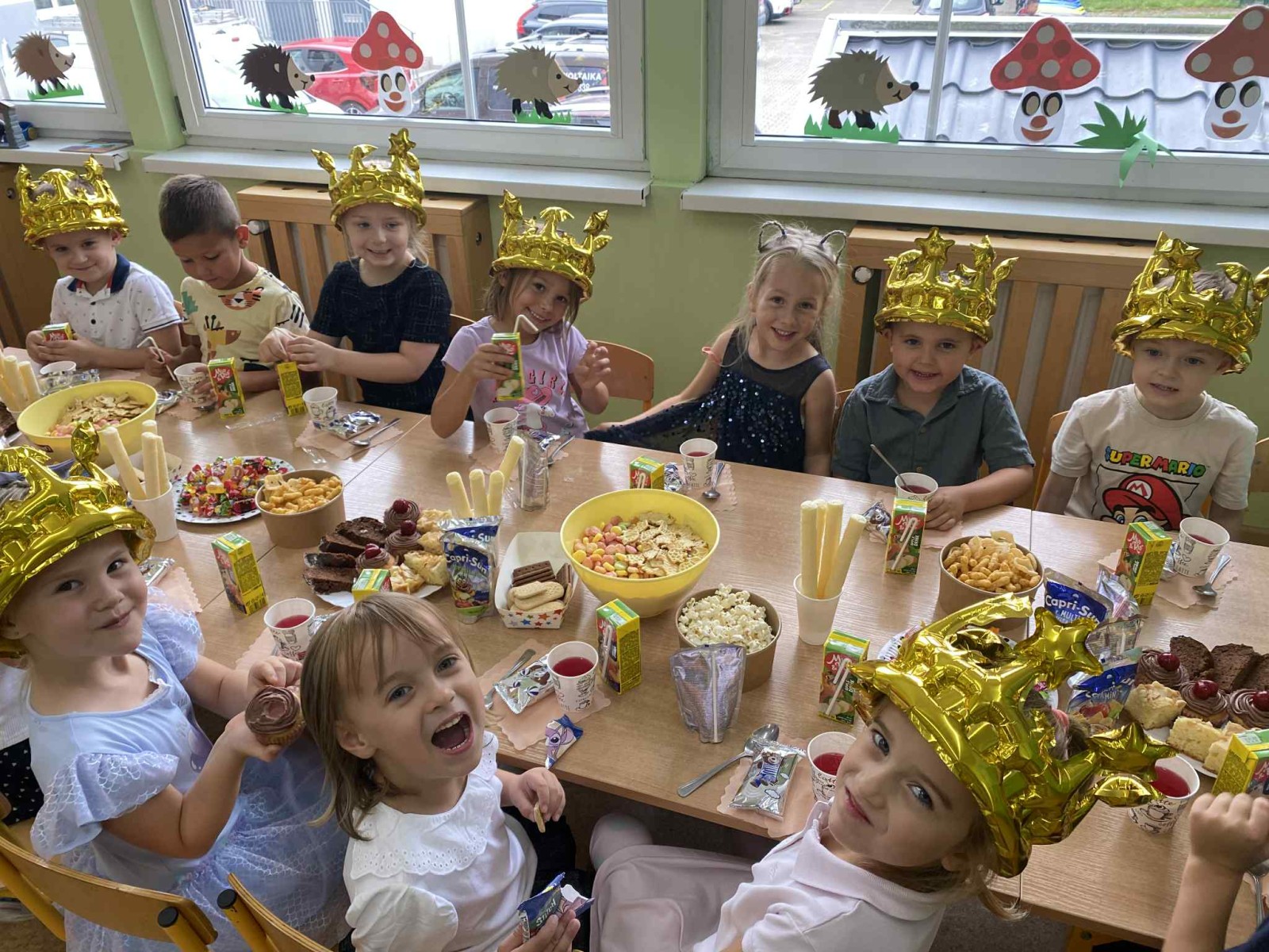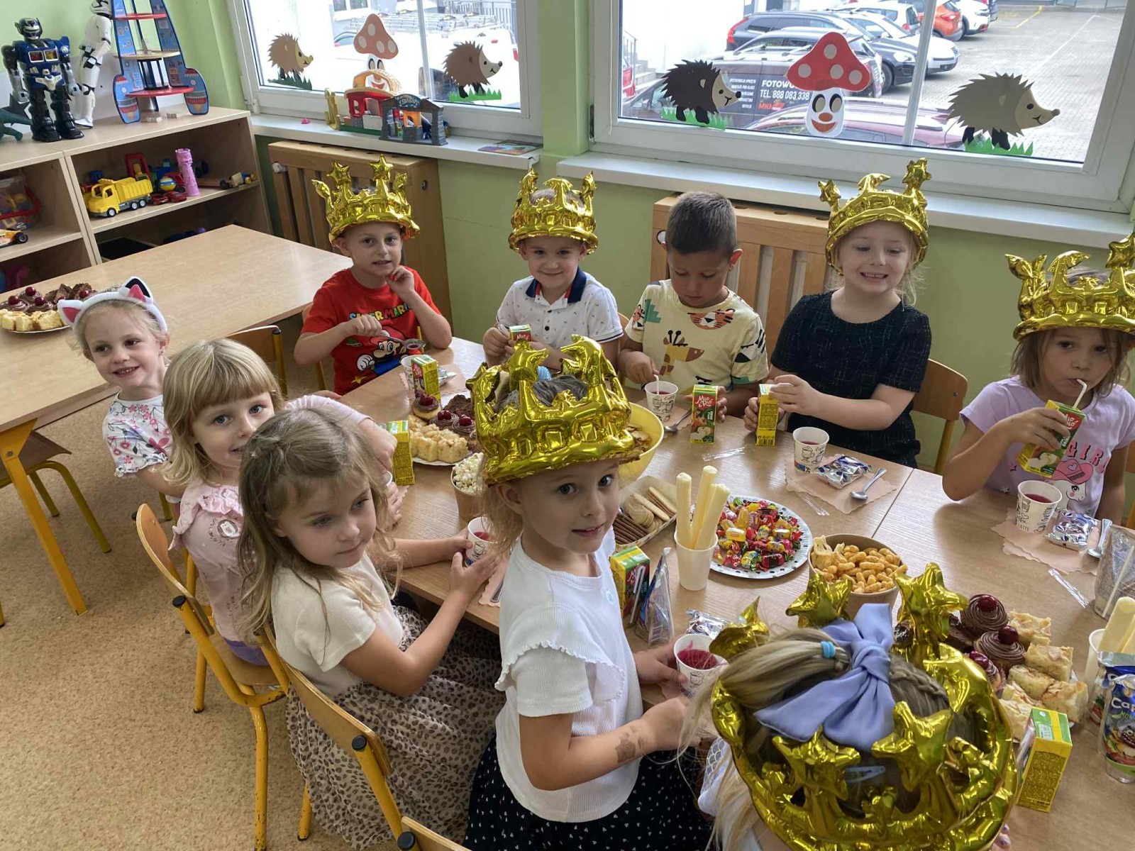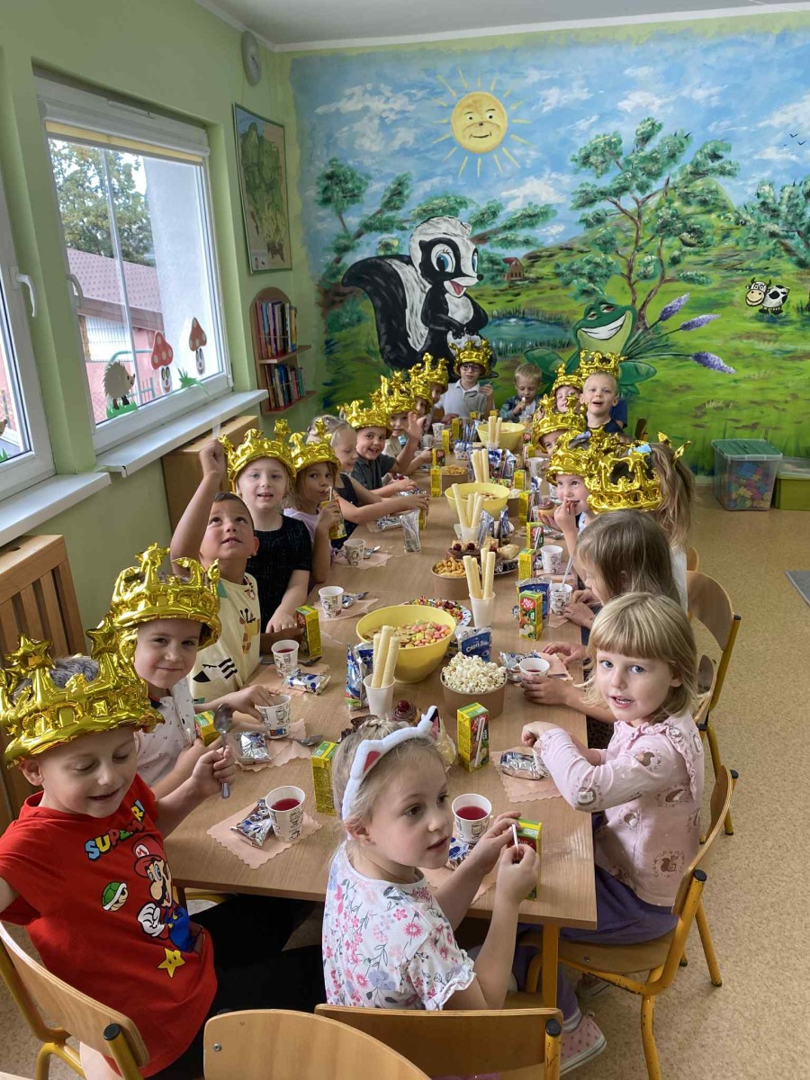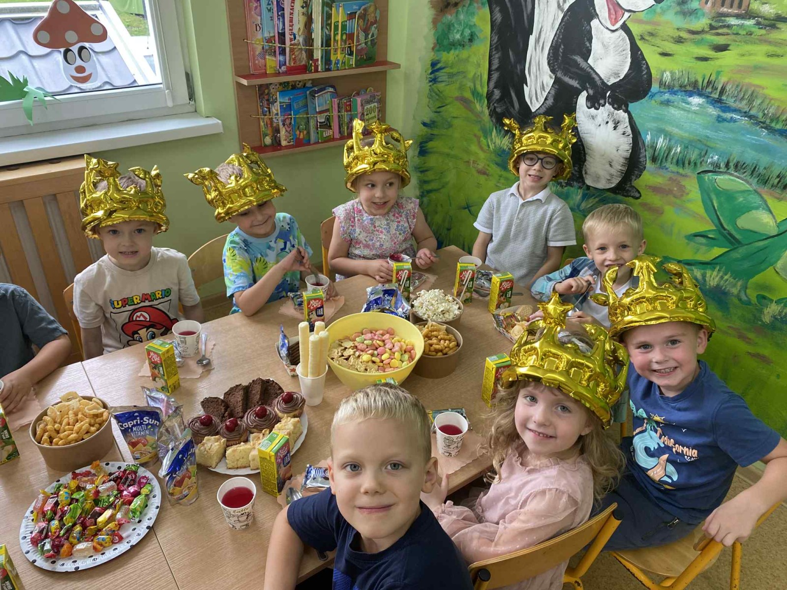 Dzień Przedszkolaka w grupie Słoneczka. Od samego rana dzieci świętowały ten wspaniały dzień. Na samym początku czekało królewskie śniadanie, a każdy przedszkolak otrzymał koronę, by poczuć się jak prawdziwy król i królowa. Nie zabrakło oczywiście tańców przy ulubionych piosenkach, wspólnych gier i zabaw oraz słodkiego poczęstunku. Atmosfera była radosna, pełna śmiechu i dobrej zabawy. Na zakończenie tego niezwykłego dnia każde dziecko zabrało do domu pamiątkowy medal Super Przedszkolaka, koronę oraz balon. Serdecznie dziękujemy Rodzicom za ogromny wkład i zaangażowanie w przygotowanie tej uroczystości – za pomoc, przyniesione smakołyki, ogromny wkład w ten wyjątkowy dzień, za chęć upieczenia ciast i wspólne stworzenie tak wspaniałej atmosfery. Dzięki Wam ten dzień na długo pozostanie w pamięci dzieci!