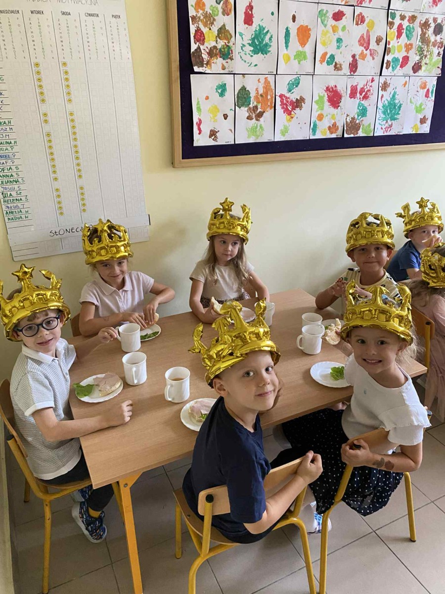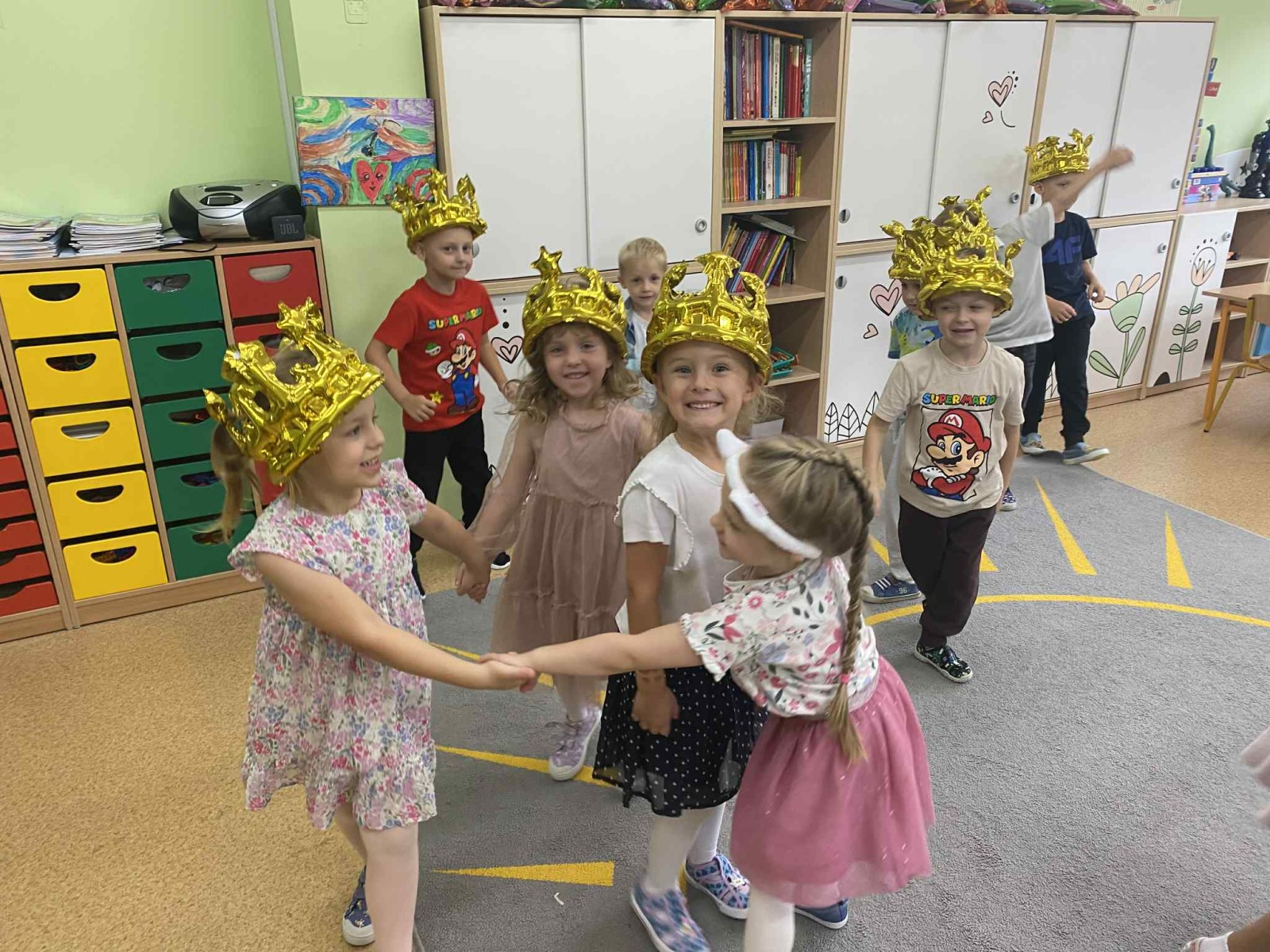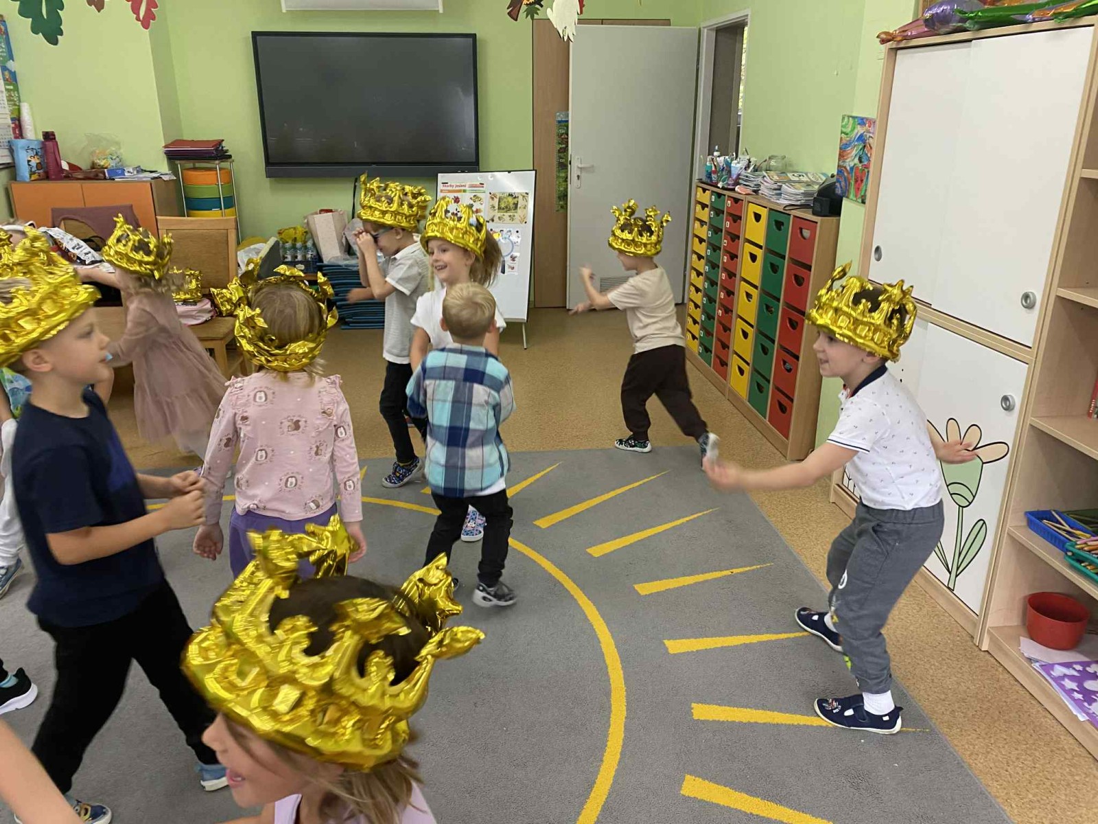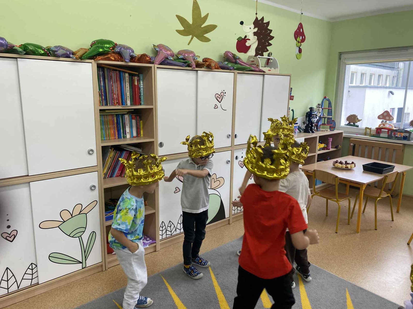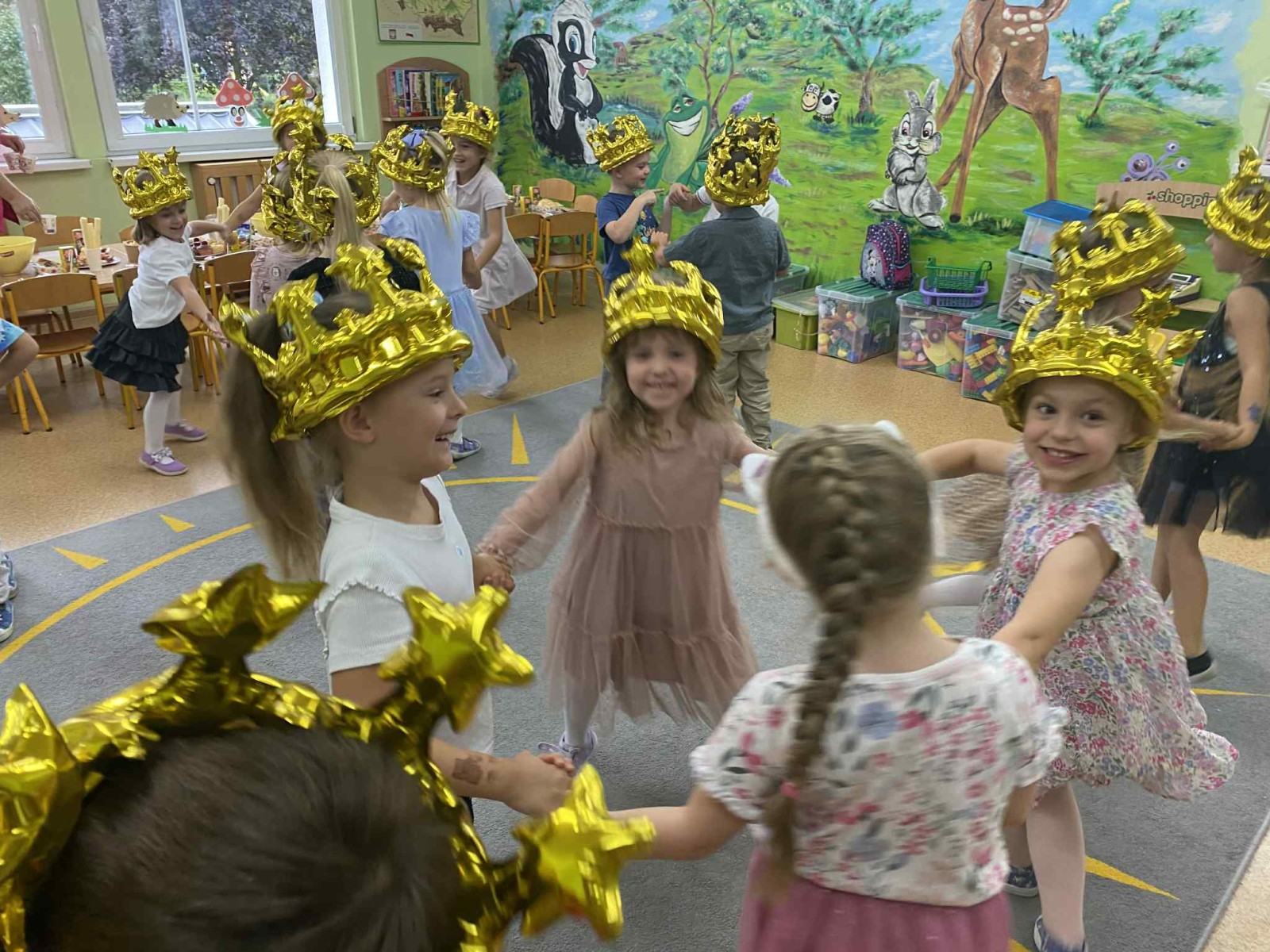 Dzień Przedszkolaka w grupie Słoneczka. Od samego rana dzieci świętowały ten wspaniały dzień. Na samym początku czekało królewskie śniadanie, a każdy przedszkolak otrzymał koronę, by poczuć się jak prawdziwy król i królowa. Nie zabrakło oczywiście tańców przy ulubionych piosenkach, wspólnych gier i zabaw oraz słodkiego poczęstunku. Atmosfera była radosna, pełna śmiechu i dobrej zabawy. Na zakończenie tego niezwykłego dnia każde dziecko zabrało do domu pamiątkowy medal Super Przedszkolaka, koronę oraz balon. Serdecznie dziękujemy Rodzicom za ogromny wkład i zaangażowanie w przygotowanie tej uroczystości – za pomoc, przyniesione smakołyki, ogromny wkład w ten wyjątkowy dzień, za chęć upieczenia ciast i wspólne stworzenie tak wspaniałej atmosfery. Dzięki Wam ten dzień na długo pozostanie w pamięci dzieci!