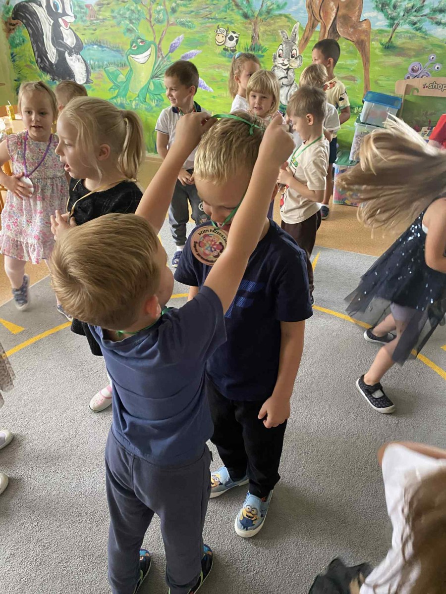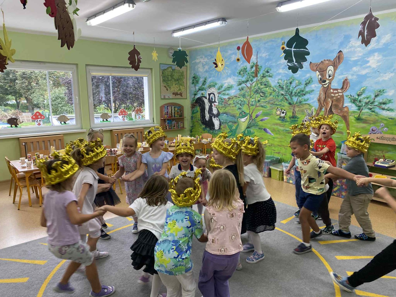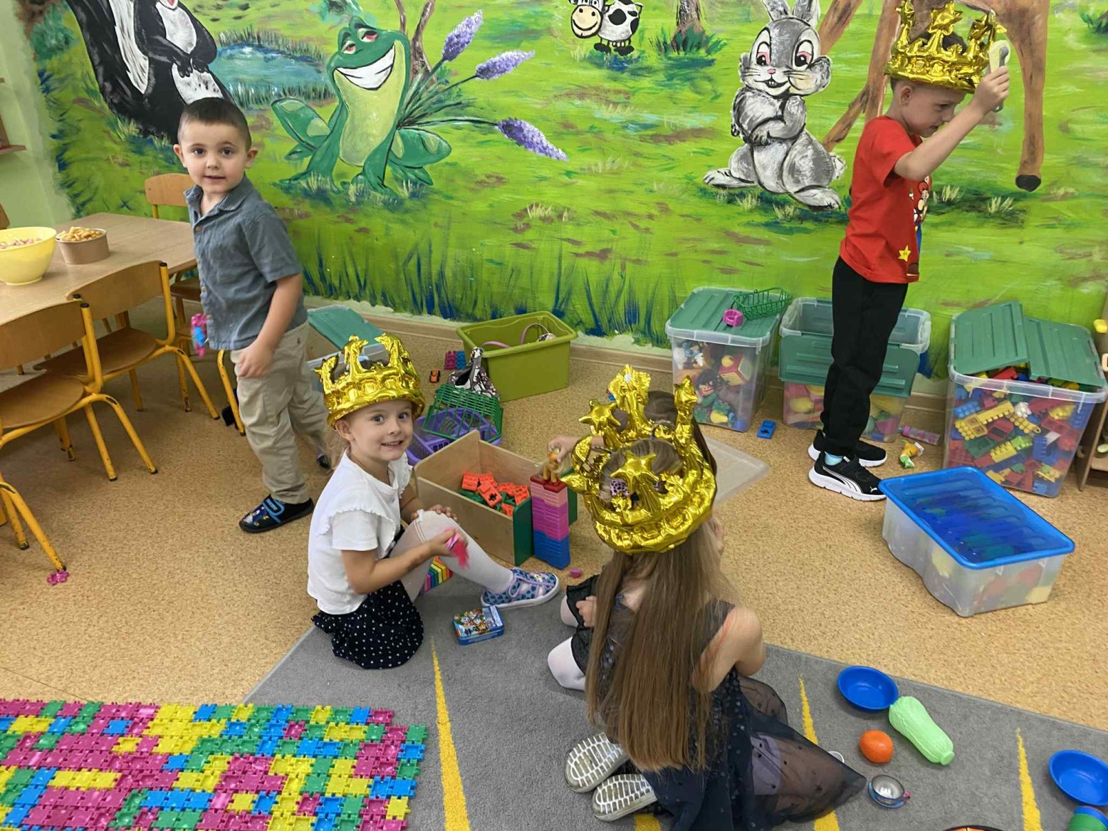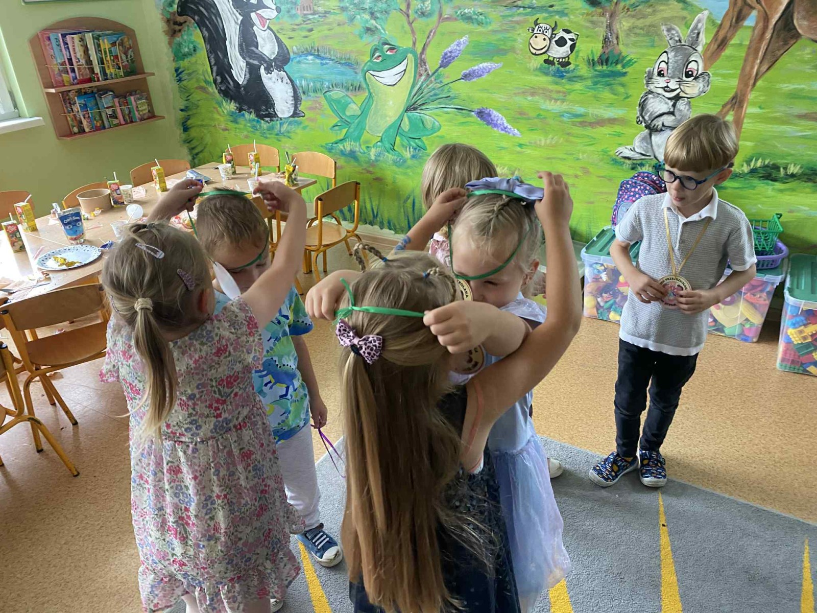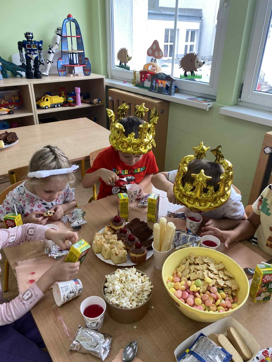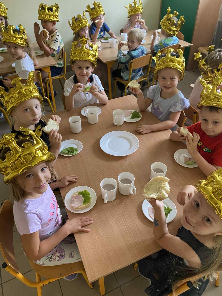 Dzień Przedszkolaka w grupie Słoneczka. Od samego rana dzieci świętowały ten wspaniały dzień. Na samym początku czekało królewskie śniadanie, a każdy przedszkolak otrzymał koronę, by poczuć się jak prawdziwy król i królowa. Nie zabrakło oczywiście tańców przy ulubionych piosenkach, wspólnych gier i zabaw oraz słodkiego poczęstunku. Atmosfera była radosna, pełna śmiechu i dobrej zabawy. Na zakończenie tego niezwykłego dnia każde dziecko zabrało do domu pamiątkowy medal Super Przedszkolaka, koronę oraz balon. Serdecznie dziękujemy Rodzicom za ogromny wkład i zaangażowanie w przygotowanie tej uroczystości – za pomoc, przyniesione smakołyki, ogromny wkład w ten wyjątkowy dzień, za chęć upieczenia ciast i wspólne stworzenie tak wspaniałej atmosfery. Dzięki Wam ten dzień na długo pozostanie w pamięci dzieci!