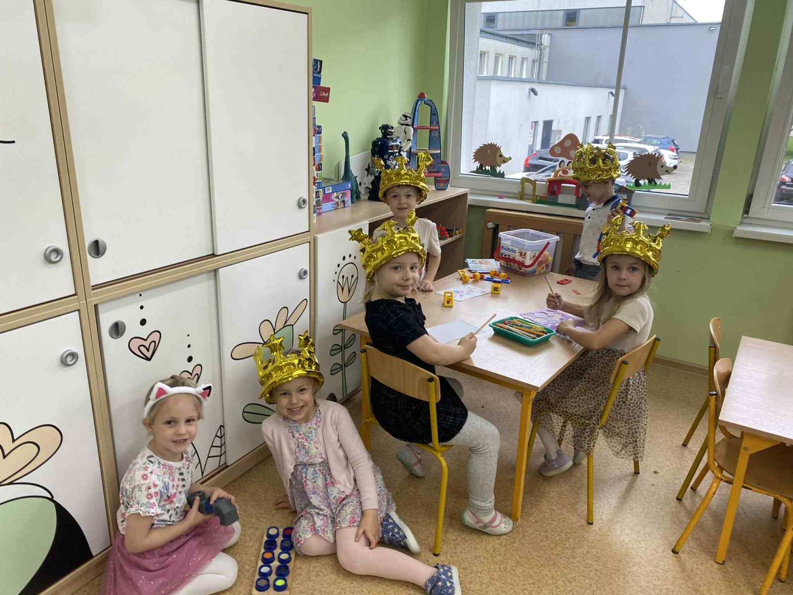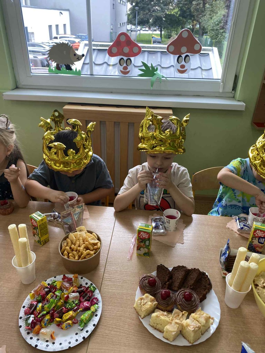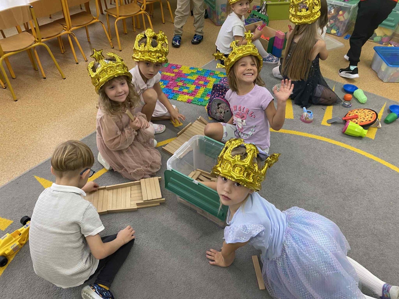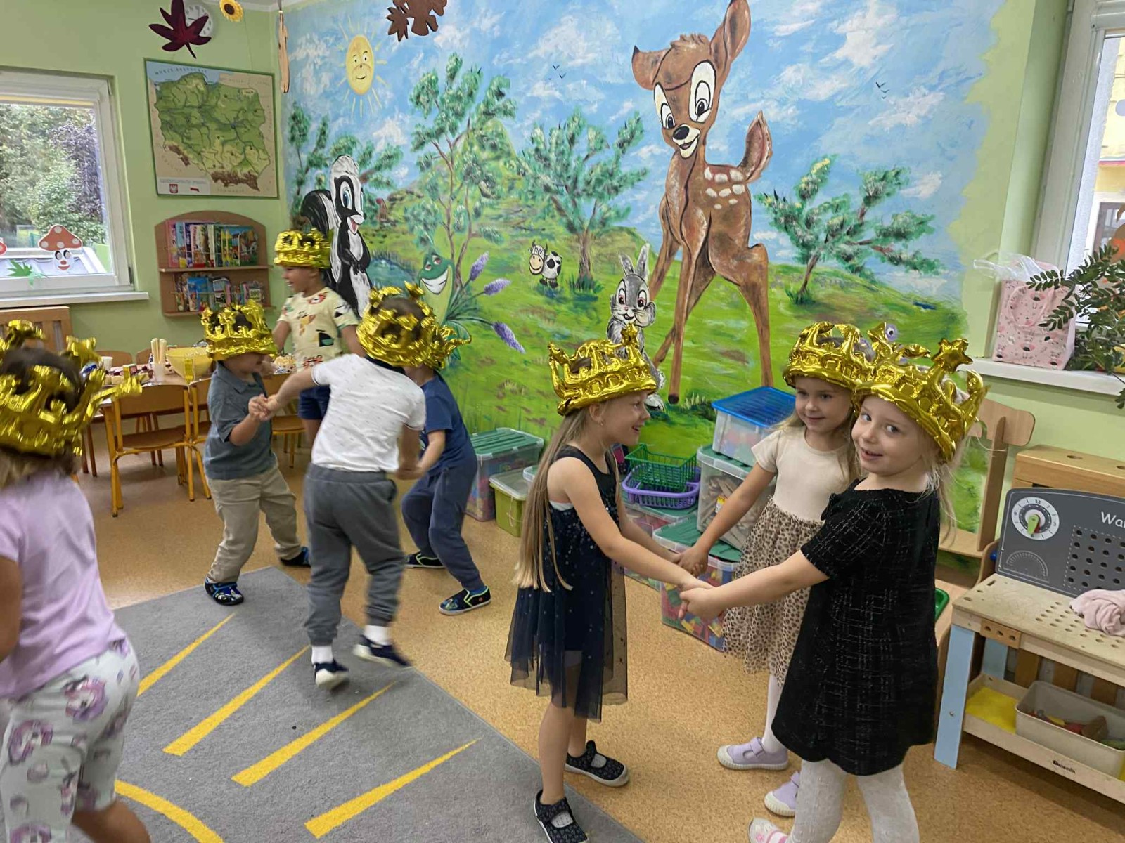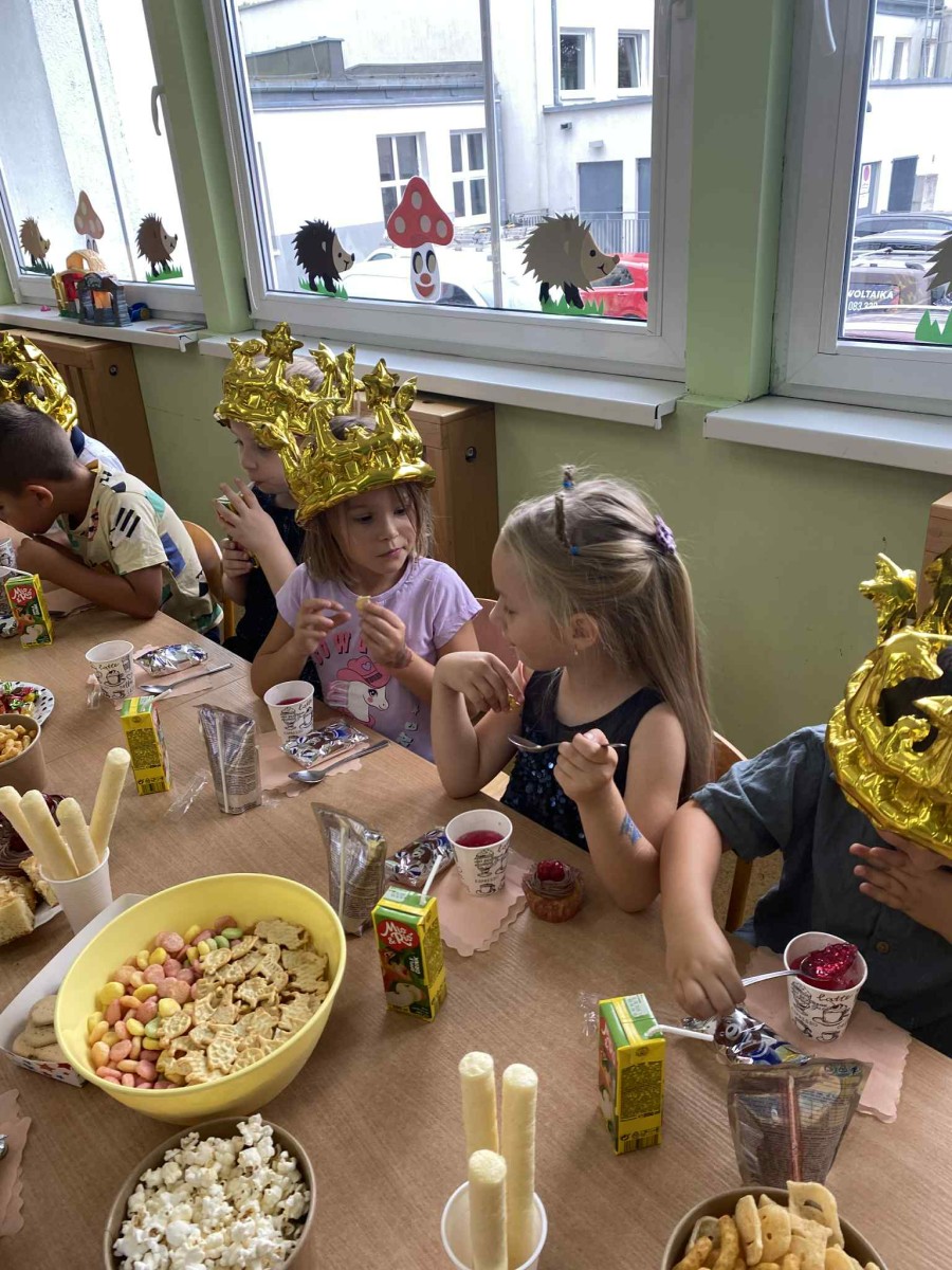 Dzień Przedszkolaka w grupie Słoneczka. Od samego rana dzieci świętowały ten wspaniały dzień. Na samym początku czekało królewskie śniadanie, a każdy przedszkolak otrzymał koronę, by poczuć się jak prawdziwy król i królowa. Nie zabrakło oczywiście tańców przy ulubionych piosenkach, wspólnych gier i zabaw oraz słodkiego poczęstunku. Atmosfera była radosna, pełna śmiechu i dobrej zabawy. Na zakończenie tego niezwykłego dnia każde dziecko zabrało do domu pamiątkowy medal Super Przedszkolaka, koronę oraz balon. Serdecznie dziękujemy Rodzicom za ogromny wkład i zaangażowanie w przygotowanie tej uroczystości – za pomoc, przyniesione smakołyki, ogromny wkład w ten wyjątkowy dzień, za chęć upieczenia ciast i wspólne stworzenie tak wspaniałej atmosfery. Dzięki Wam ten dzień na długo pozostanie w pamięci dzieci!