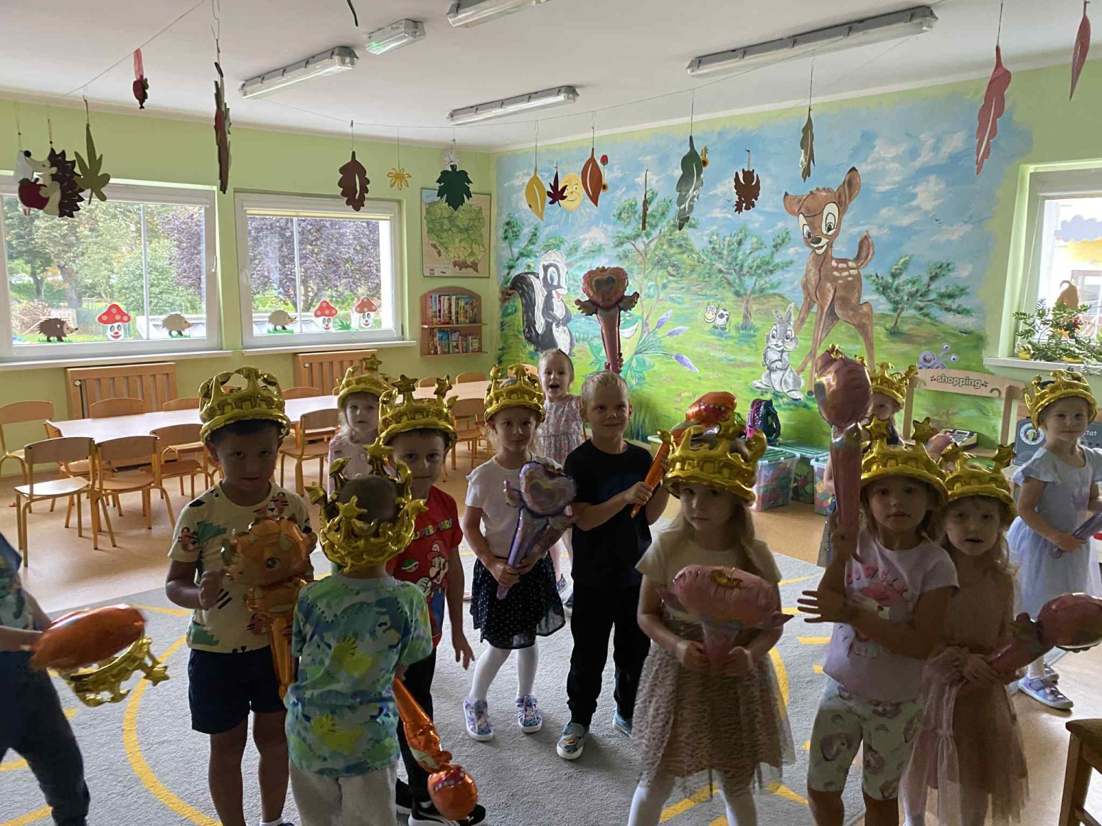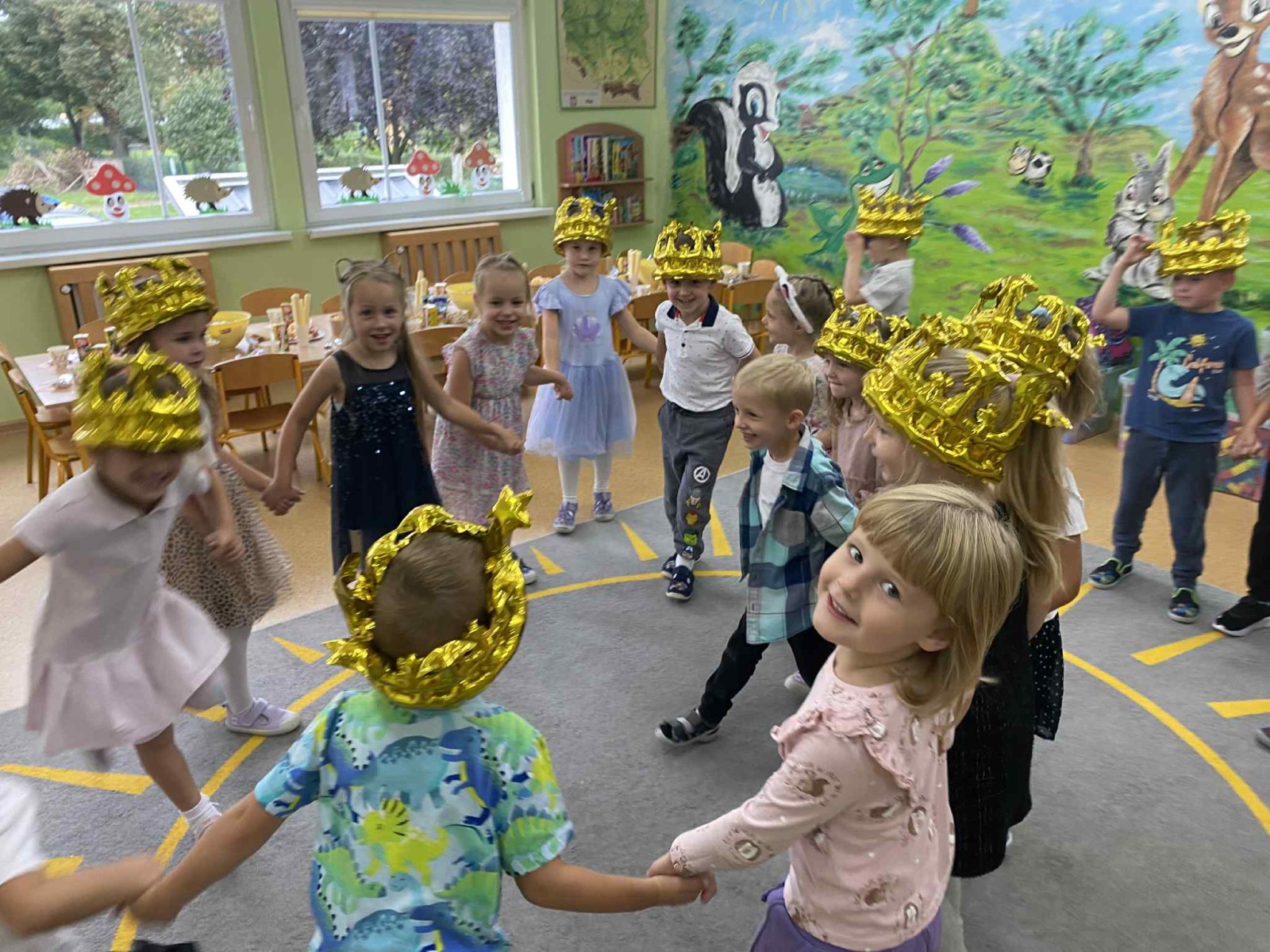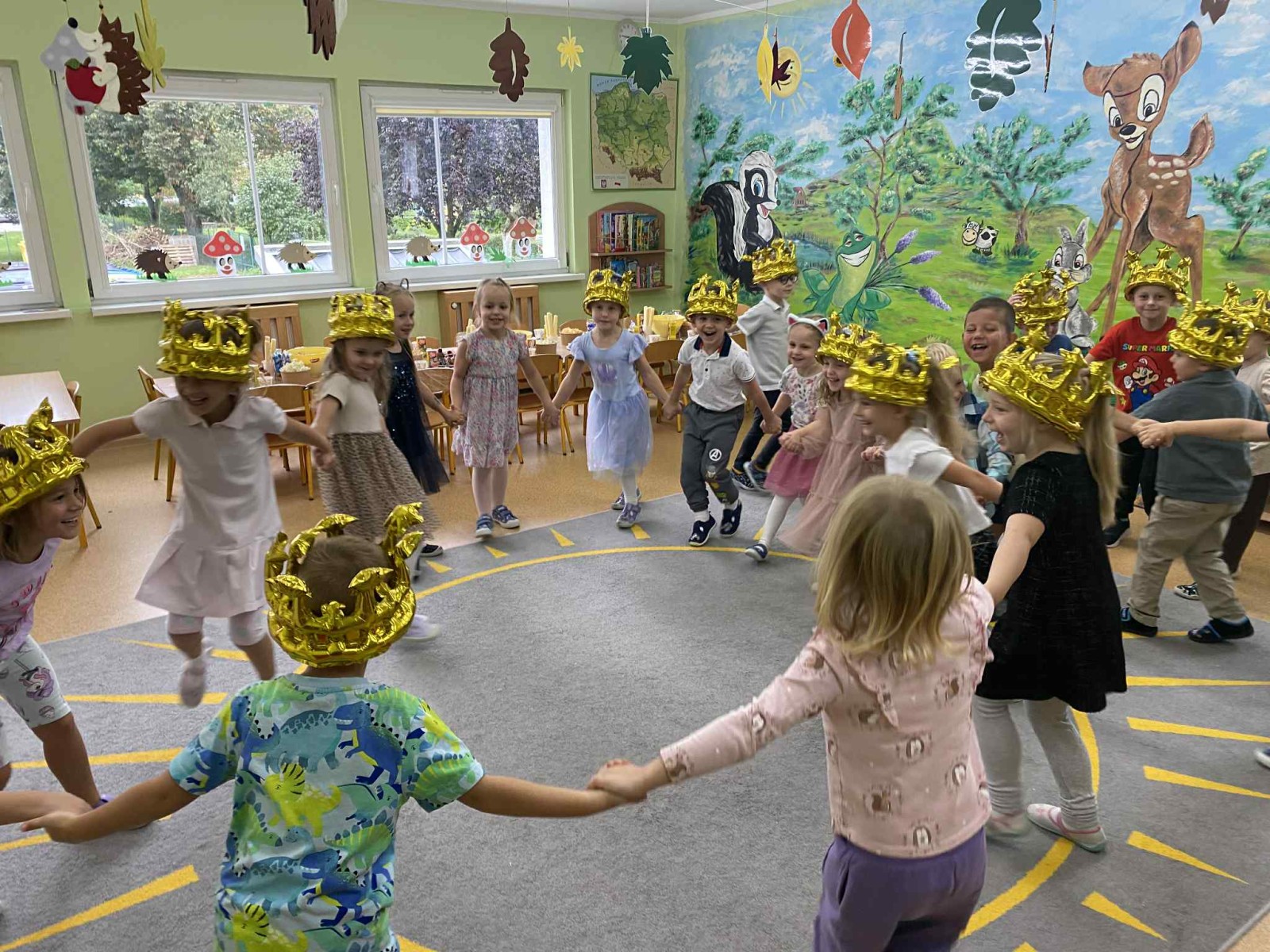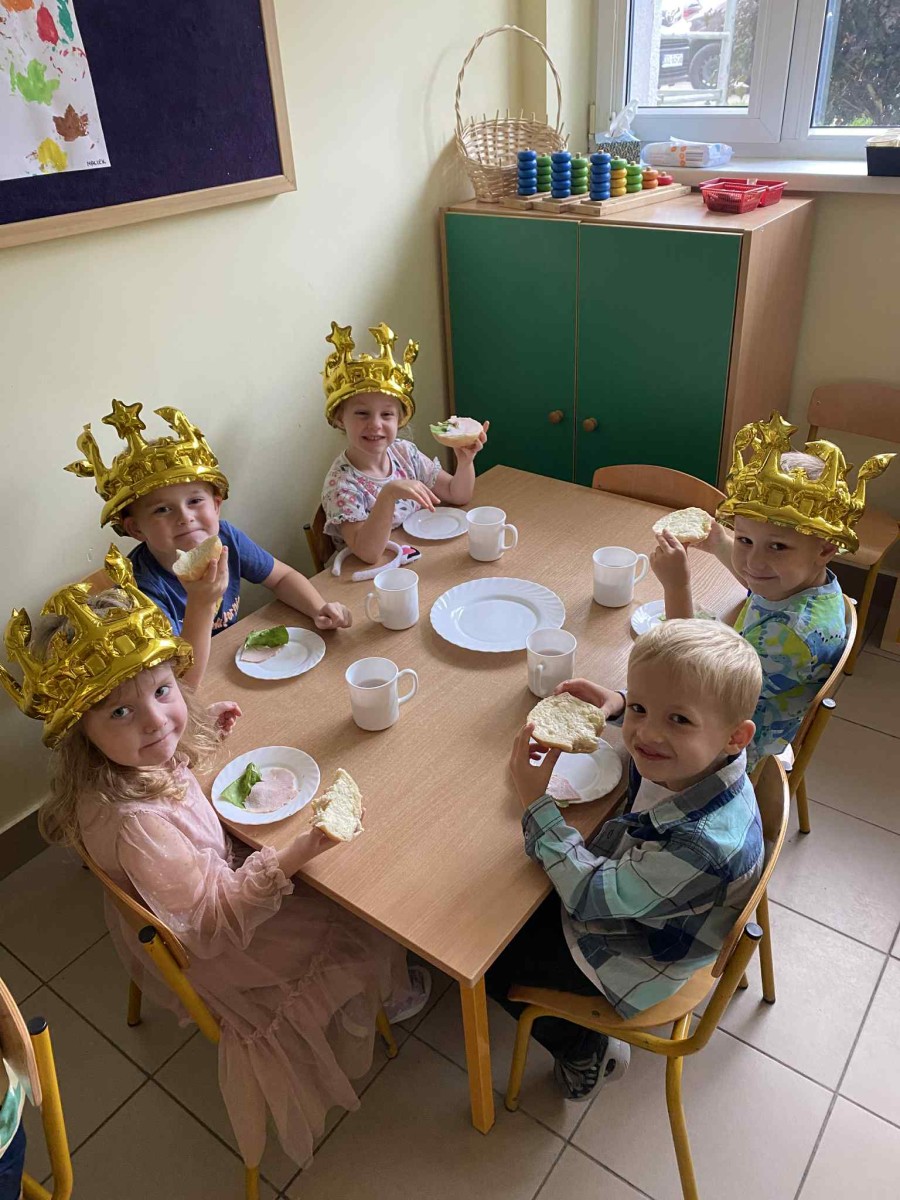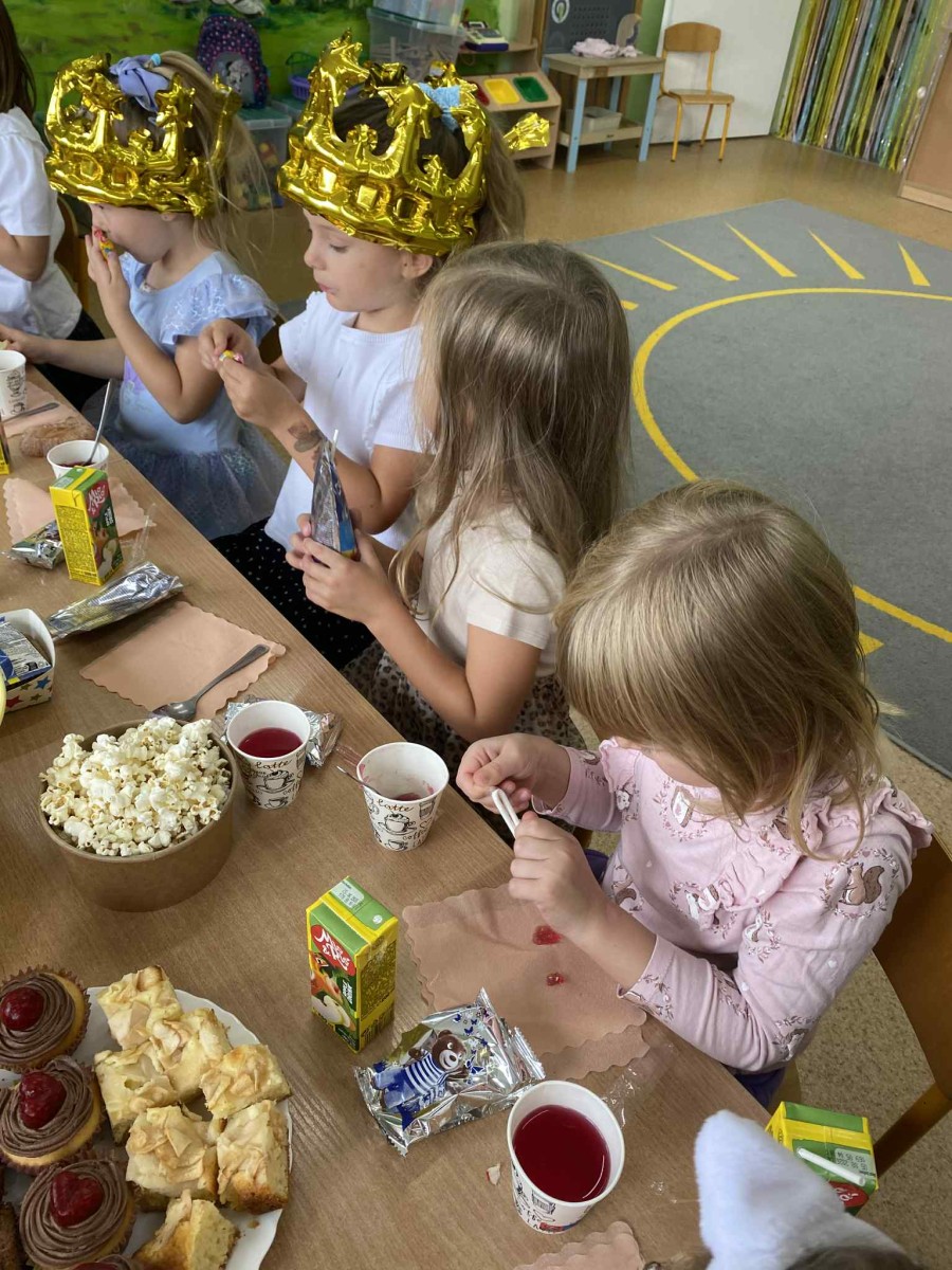 Dzień Przedszkolaka w grupie Słoneczka. Od samego rana dzieci świętowały ten wspaniały dzień. Na samym początku czekało królewskie śniadanie, a każdy przedszkolak otrzymał koronę, by poczuć się jak prawdziwy król i królowa. Nie zabrakło oczywiście tańców przy ulubionych piosenkach, wspólnych gier i zabaw oraz słodkiego poczęstunku. Atmosfera była radosna, pełna śmiechu i dobrej zabawy. Na zakończenie tego niezwykłego dnia każde dziecko zabrało do domu pamiątkowy medal Super Przedszkolaka, koronę oraz balon. Serdecznie dziękujemy Rodzicom za ogromny wkład i zaangażowanie w przygotowanie tej uroczystości – za pomoc, przyniesione smakołyki, ogromny wkład w ten wyjątkowy dzień, za chęć upieczenia ciast i wspólne stworzenie tak wspaniałej atmosfery. Dzięki Wam ten dzień na długo pozostanie w pamięci dzieci!