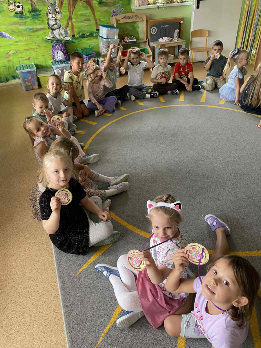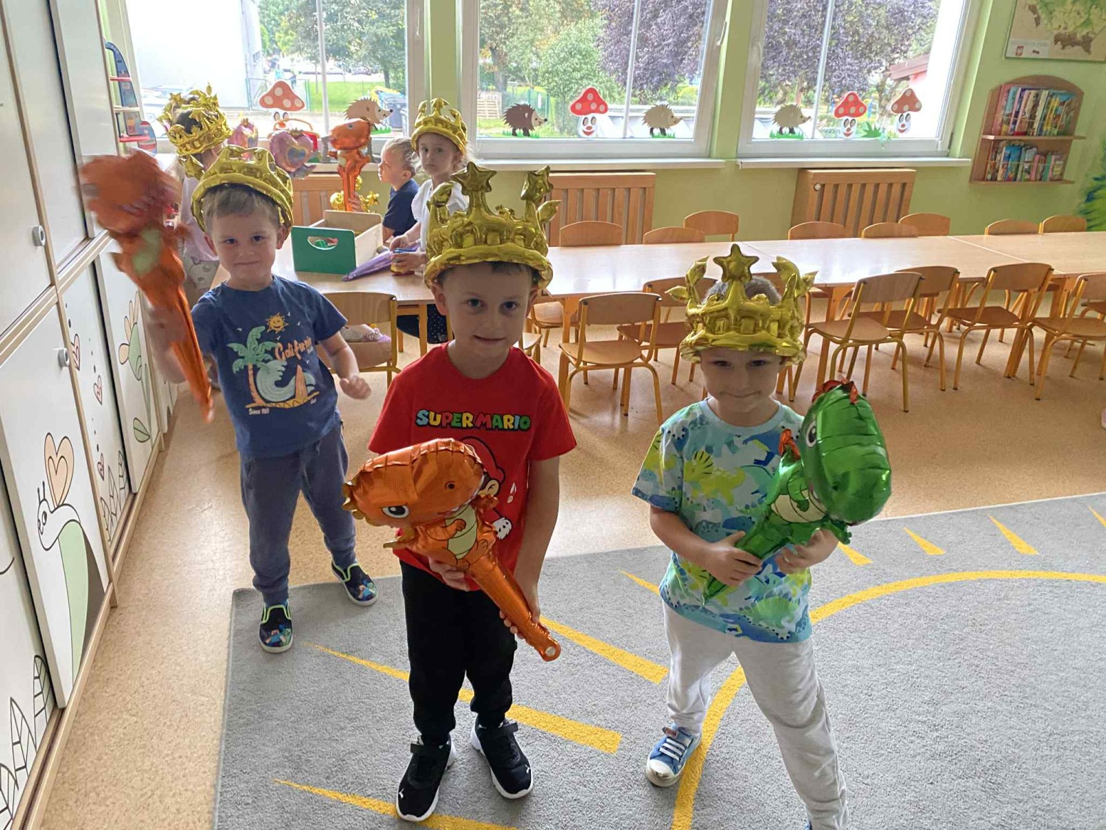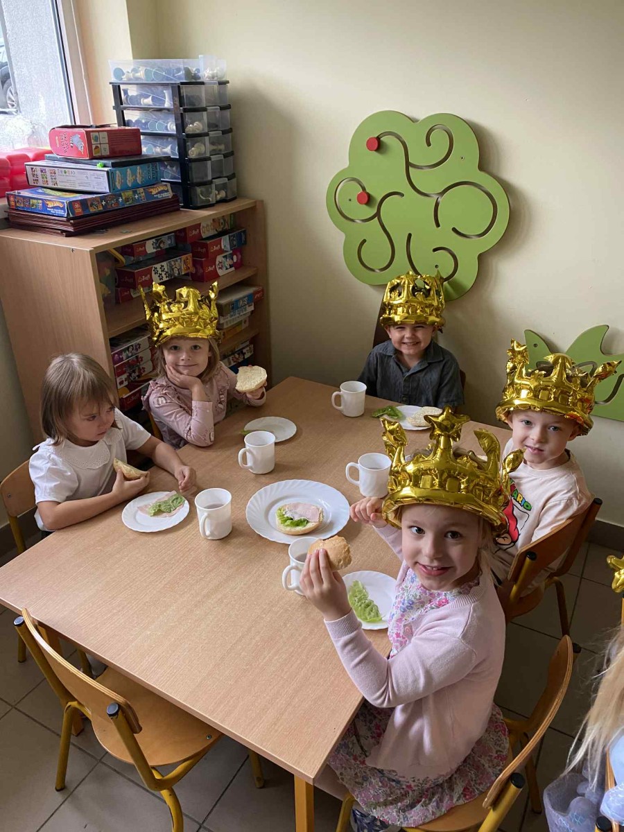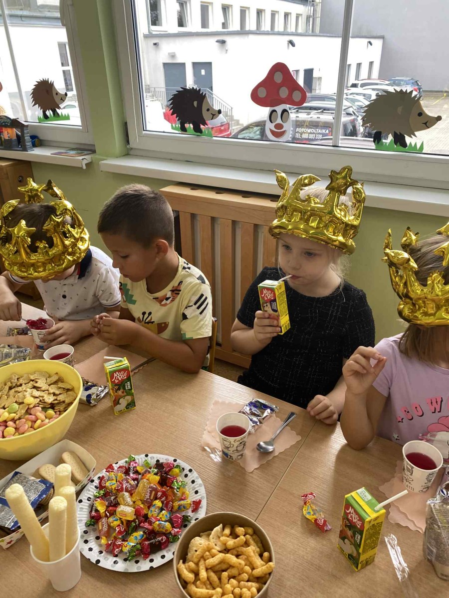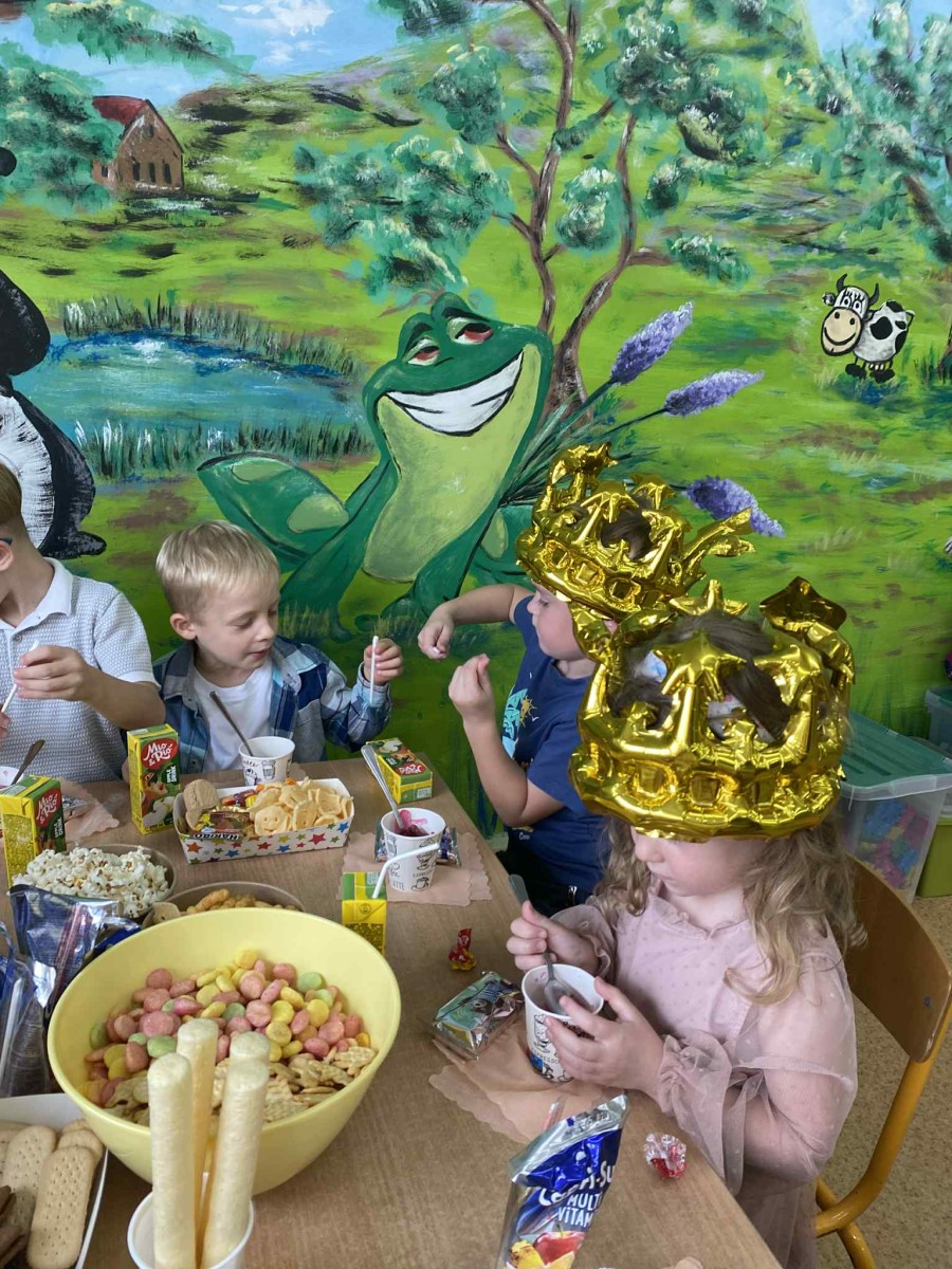 Dzień Przedszkolaka w grupie Słoneczka. Od samego rana dzieci świętowały ten wspaniały dzień. Na samym początku czekało królewskie śniadanie, a każdy przedszkolak otrzymał koronę, by poczuć się jak prawdziwy król i królowa. Nie zabrakło oczywiście tańców przy ulubionych piosenkach, wspólnych gier i zabaw oraz słodkiego poczęstunku. Atmosfera była radosna, pełna śmiechu i dobrej zabawy. Na zakończenie tego niezwykłego dnia każde dziecko zabrało do domu pamiątkowy medal Super Przedszkolaka, koronę oraz balon. Serdecznie dziękujemy Rodzicom za ogromny wkład i zaangażowanie w przygotowanie tej uroczystości – za pomoc, przyniesione smakołyki, ogromny wkład w ten wyjątkowy dzień, za chęć upieczenia ciast i wspólne stworzenie tak wspaniałej atmosfery. Dzięki Wam ten dzień na długo pozostanie w pamięci dzieci!