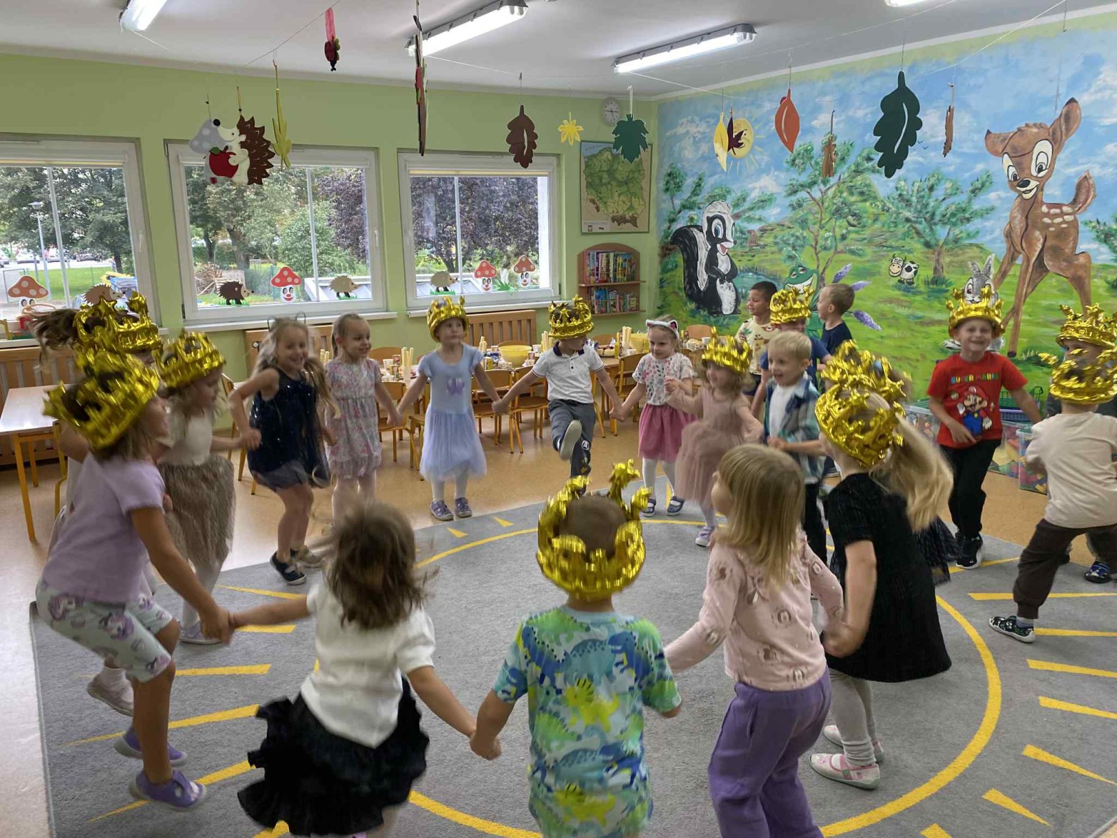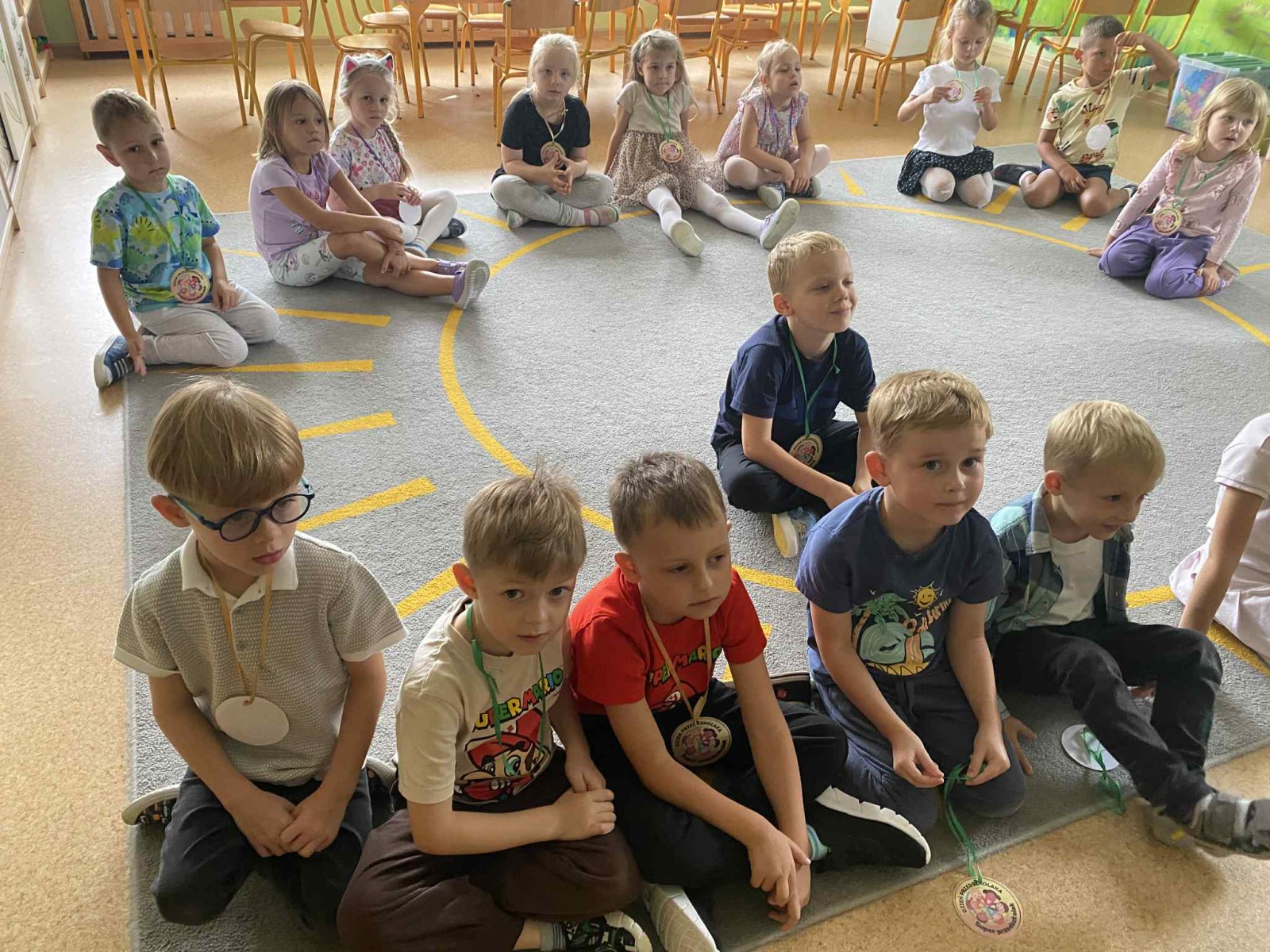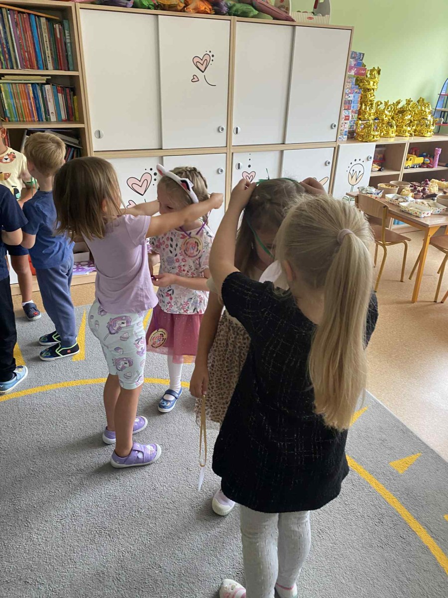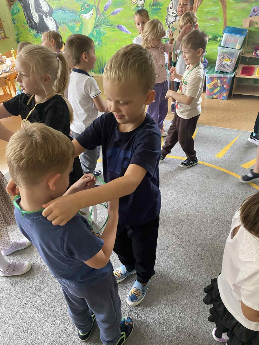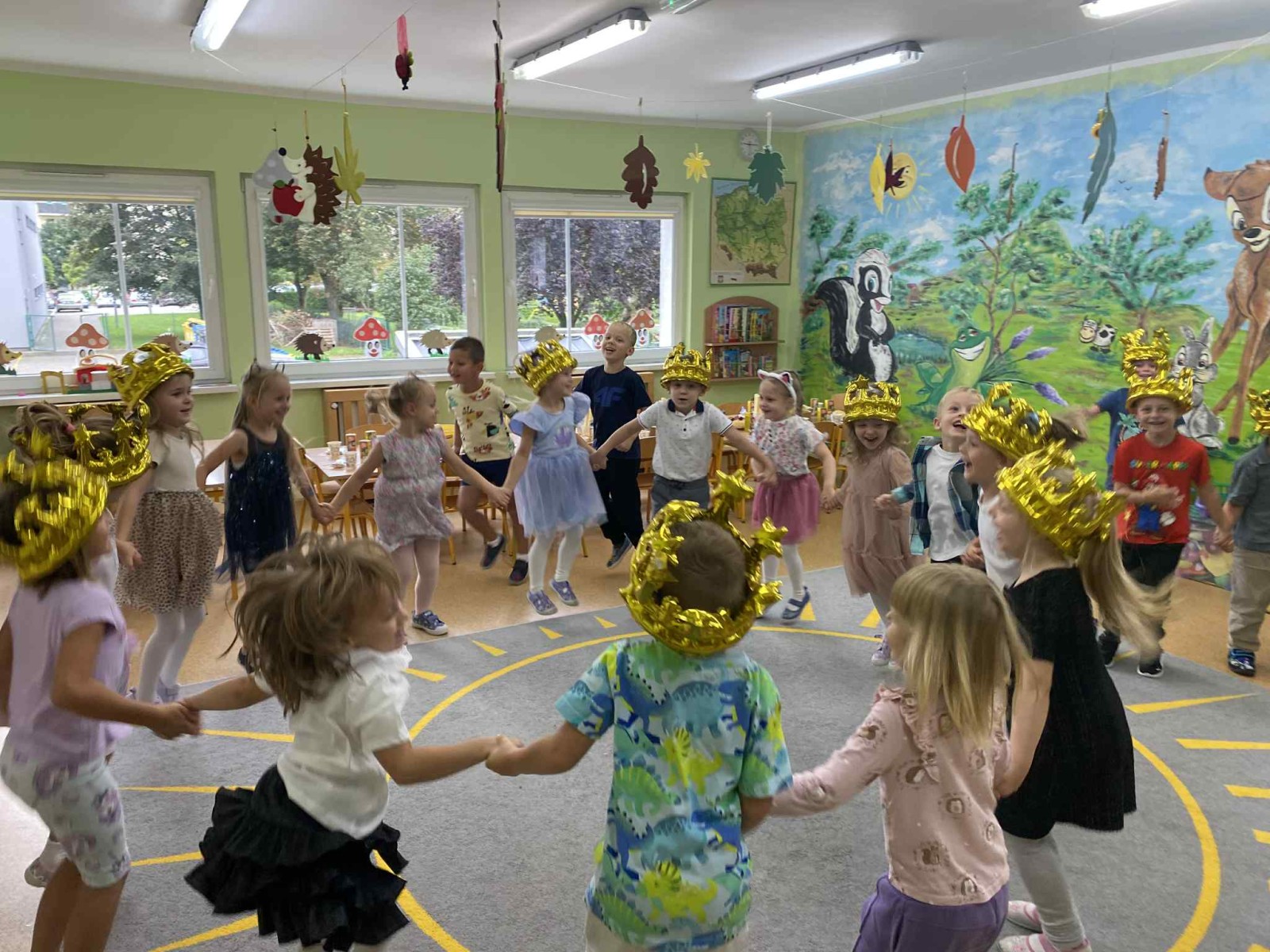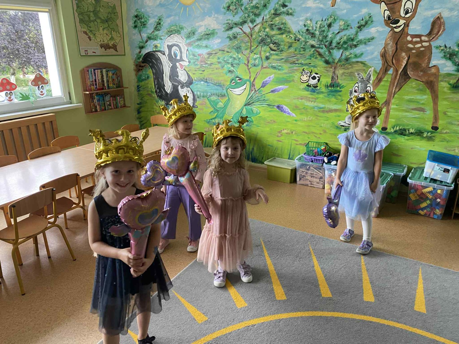 Dzień Przedszkolaka w grupie Słoneczka. Od samego rana dzieci świętowały ten wspaniały dzień. Na samym początku czekało królewskie śniadanie, a każdy przedszkolak otrzymał koronę, by poczuć się jak prawdziwy król i królowa. Nie zabrakło oczywiście tańców przy ulubionych piosenkach, wspólnych gier i zabaw oraz słodkiego poczęstunku. Atmosfera była radosna, pełna śmiechu i dobrej zabawy. Na zakończenie tego niezwykłego dnia każde dziecko zabrało do domu pamiątkowy medal Super Przedszkolaka, koronę oraz balon. Serdecznie dziękujemy Rodzicom za ogromny wkład i zaangażowanie w przygotowanie tej uroczystości – za pomoc, przyniesione smakołyki, ogromny wkład w ten wyjątkowy dzień, za chęć upieczenia ciast i wspólne stworzenie tak wspaniałej atmosfery. Dzięki Wam ten dzień na długo pozostanie w pamięci dzieci!
