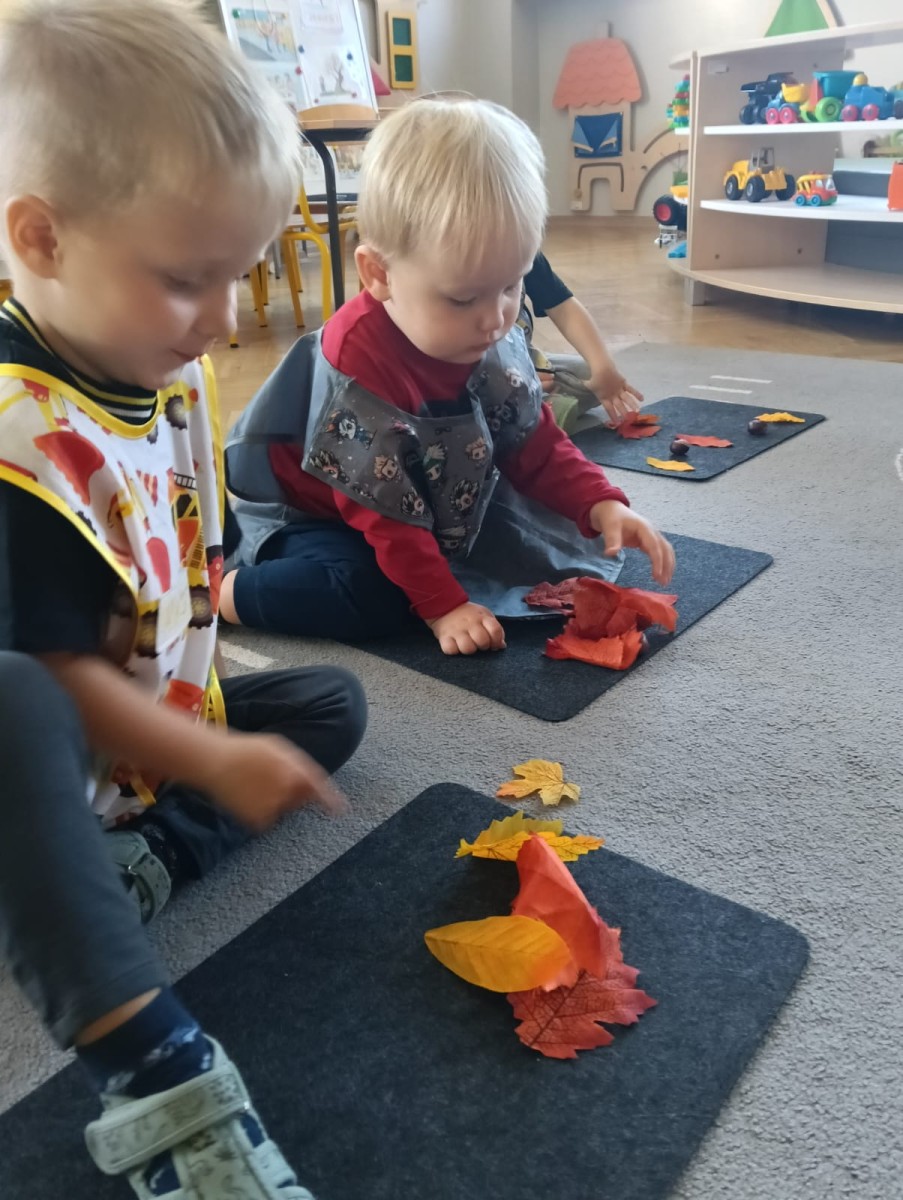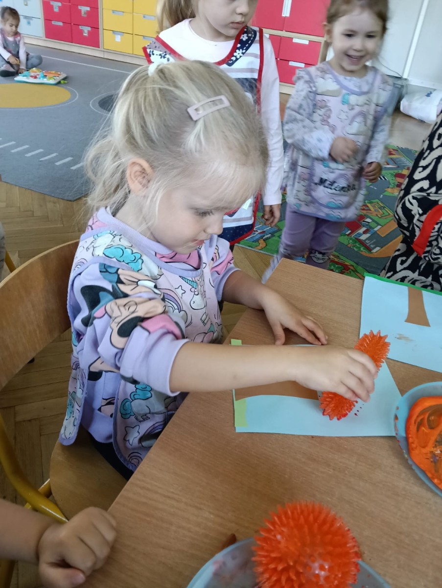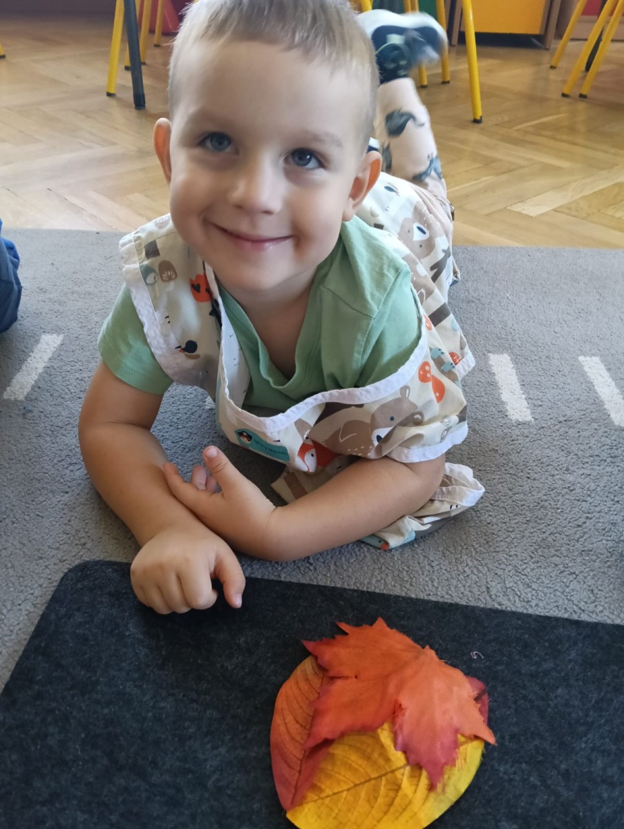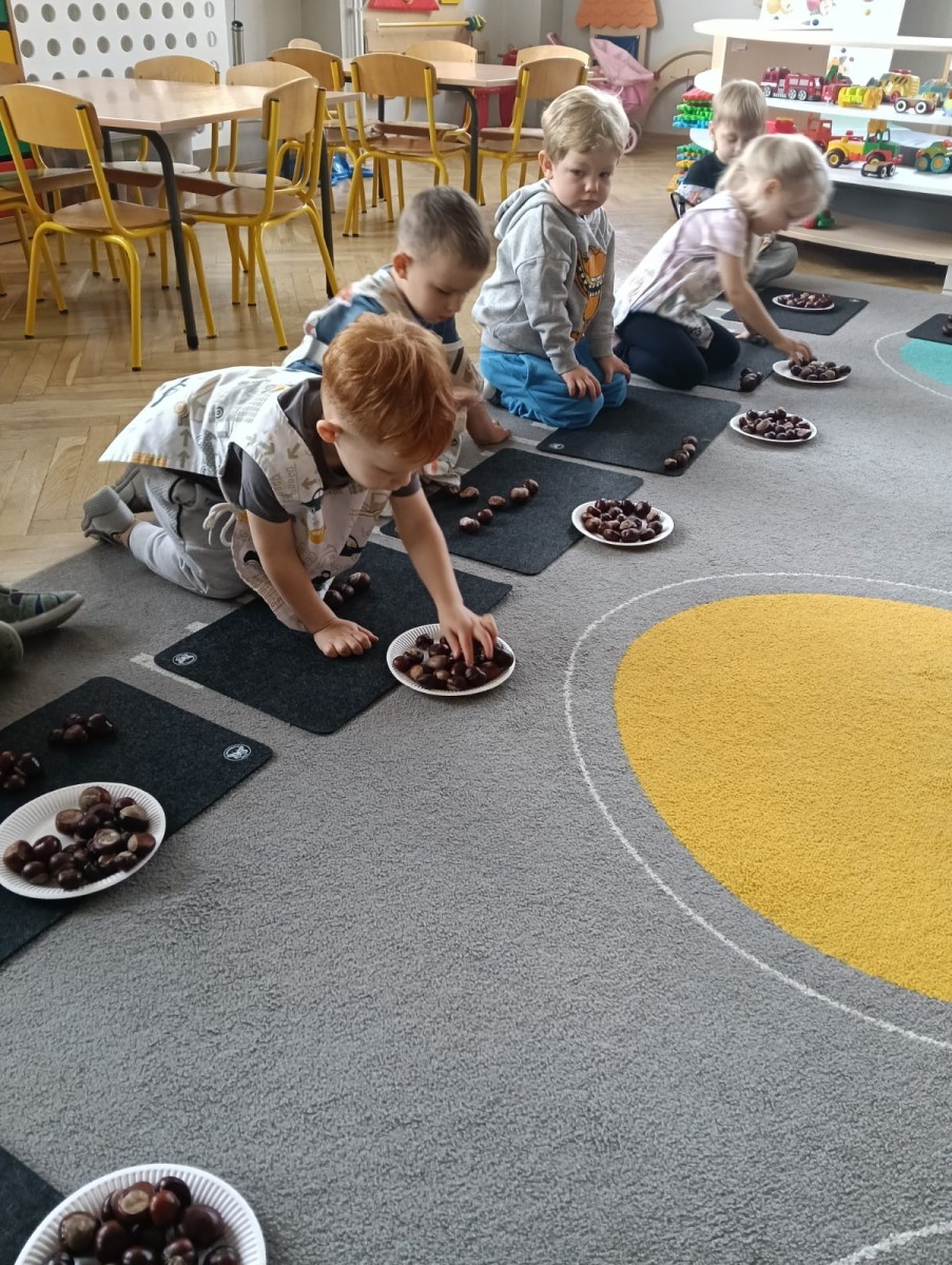 Nasze najmłodsze przedszkolaki ucieszyły się z nadejścia jesieni oraz z darów jakie przyniosła. Krasnale uczestniczyły w grze terenowej Zadania Pani Jesieni, a w czasie spacerów zbierały kasztany. Te jesienne skarby posłużyły nam w zabawach kreatywnych i matematycznych. Jesień to także wiele możliwości na pracę twórczą z wykorzystaniem materiału przyrodniczego, na przykład wykorzystanie owoców jako pieczątki. Ta aktywność szczególnie spodobała się dzieciom . W oststnich dniach obchodziliśmy także Dzień Chłopaka. Rodzice przygotowali dla dzieci pyszne babeczki i wspaniałe upominki dla naszych małych kawalerów, a dziewczynki odśpiewały sto lat na cześć chłopców.
