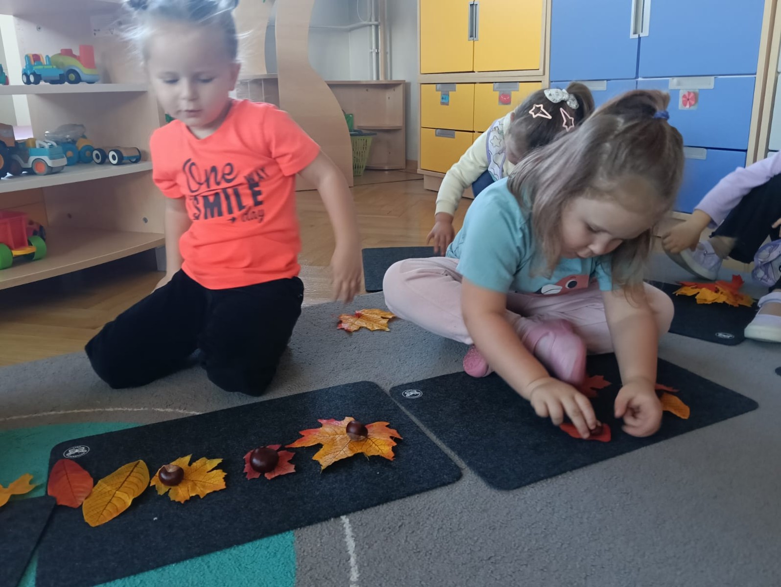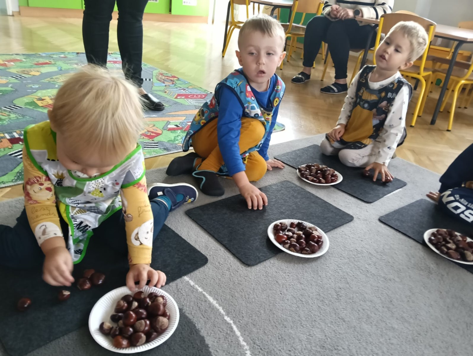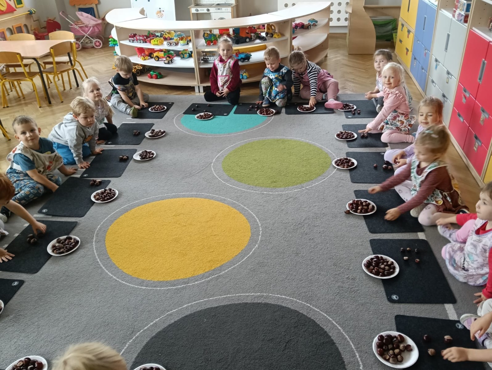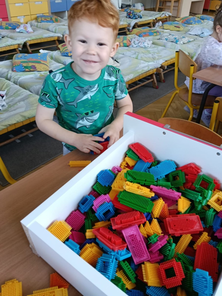 Nasze najmłodsze przedszkolaki ucieszyły się z nadejścia jesieni oraz z darów jakie przyniosła. Krasnale uczestniczyły w grze terenowej Zadania Pani Jesieni, a w czasie spacerów zbierały kasztany. Te jesienne skarby posłużyły nam w zabawach kreatywnych i matematycznych. Jesień to także wiele możliwości na pracę twórczą z wykorzystaniem materiału przyrodniczego, na przykład wykorzystanie owoców jako pieczątki. Ta aktywność szczególnie spodobała się dzieciom . W oststnich dniach obchodziliśmy także Dzień Chłopaka. Rodzice przygotowali dla dzieci pyszne babeczki i wspaniałe upominki dla naszych małych kawalerów, a dziewczynki odśpiewały sto lat na cześć chłopców.