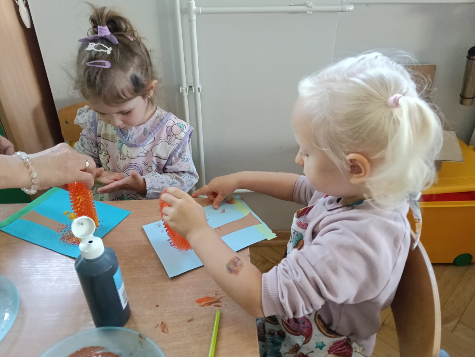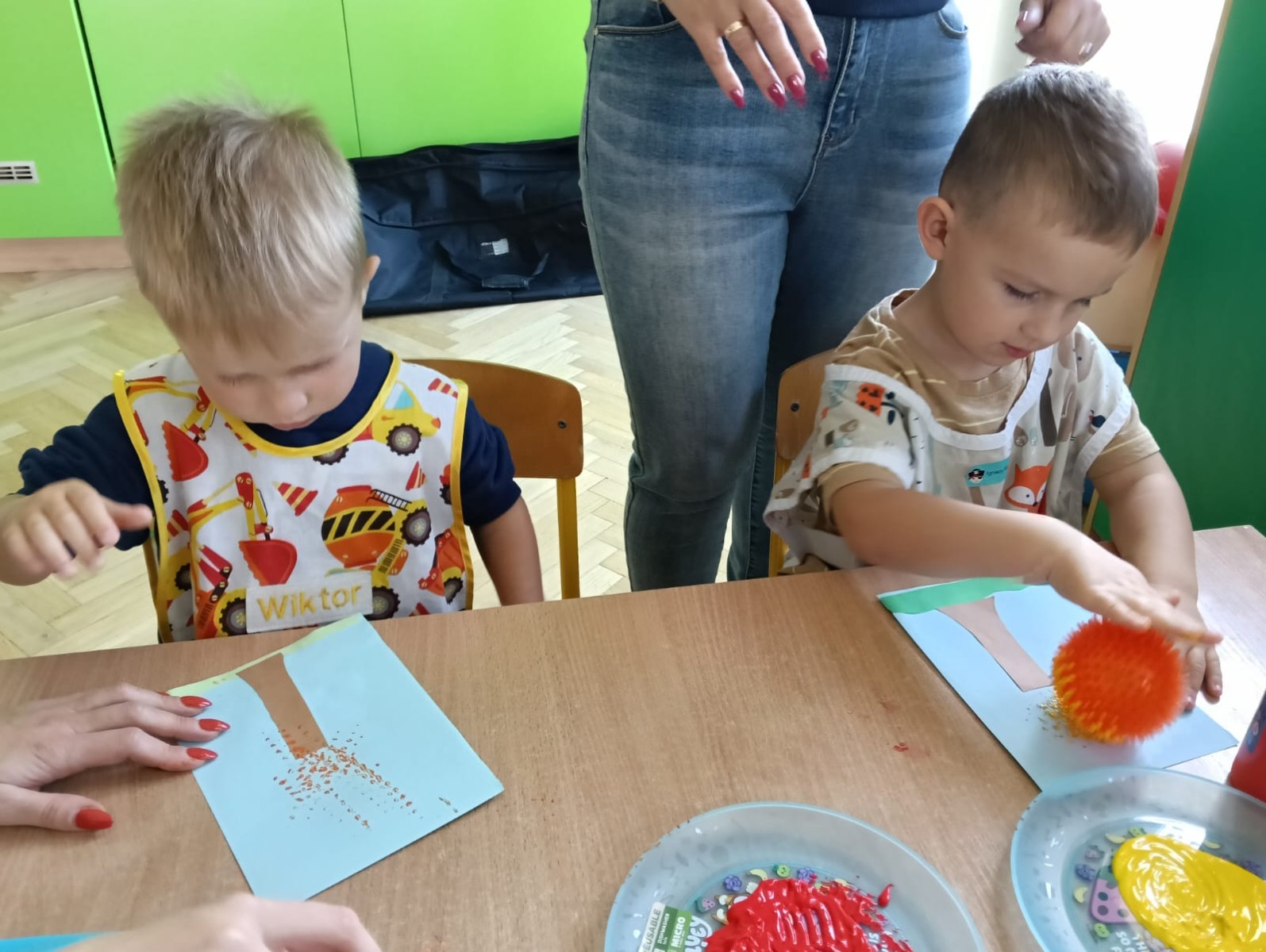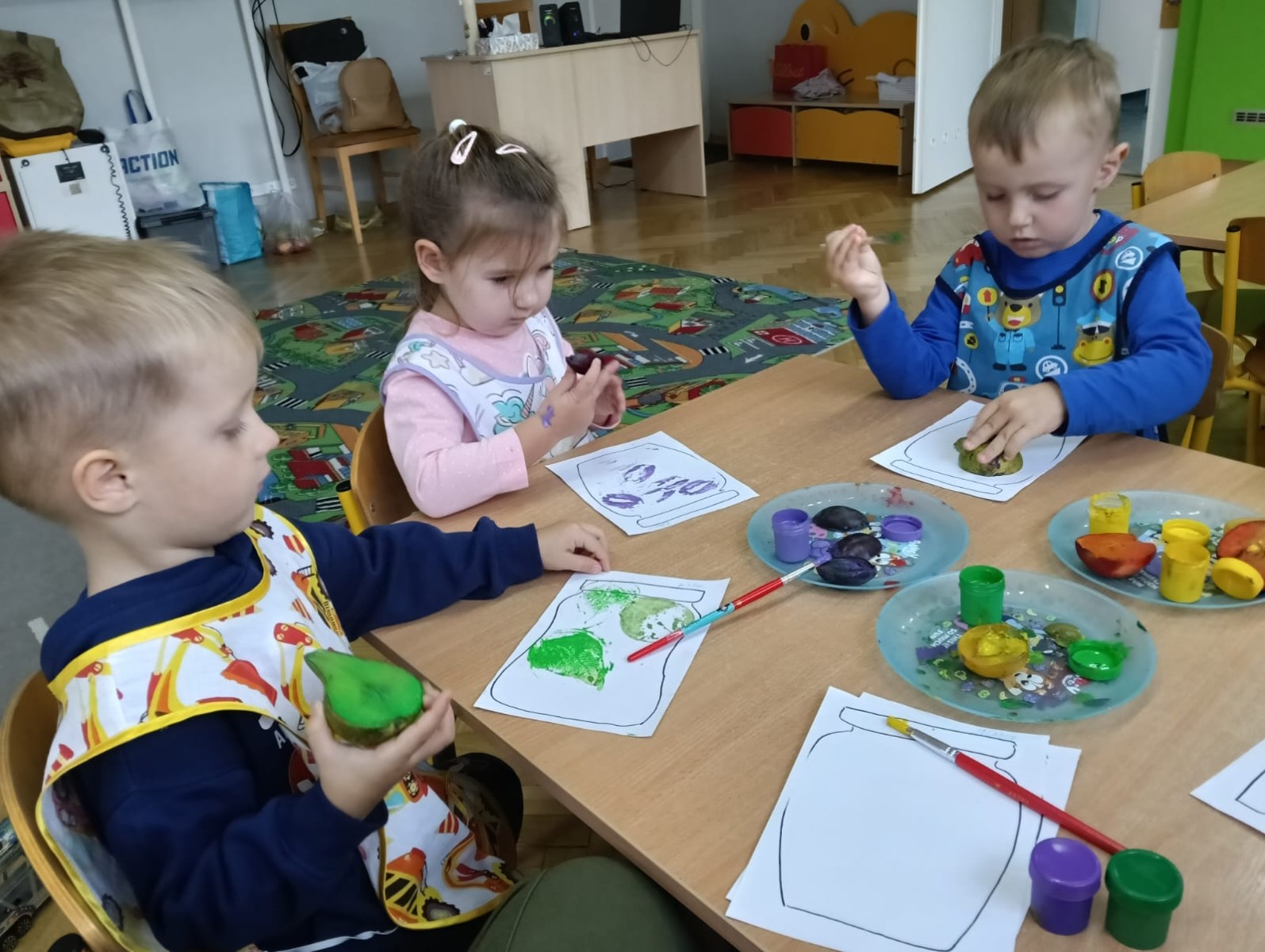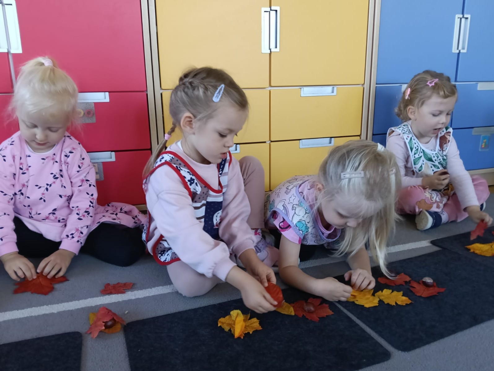Nasze najmłodsze przedszkolaki ucieszyły się z nadejścia jesieni oraz z darów jakie przyniosła. Krasnale uczestniczyły w grze terenowej Zadania Pani Jesieni, a w czasie spacerów zbierały kasztany. Te jesienne skarby posłużyły nam w zabawach kreatywnych i matematycznych. Jesień to także wiele możliwości na pracę twórczą z wykorzystaniem materiału przyrodniczego, na przykład wykorzystanie owoców jako pieczątki. Ta aktywność szczególnie spodobała się dzieciom . W oststnich dniach obchodziliśmy także Dzień Chłopaka. Rodzice przygotowali dla dzieci pyszne babeczki i wspaniałe upominki dla naszych małych kawalerów, a dziewczynki odśpiewały sto lat na cześć chłopców.