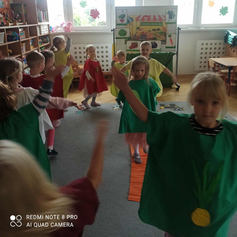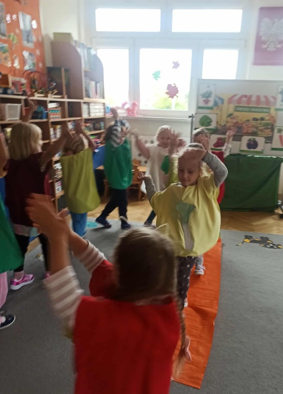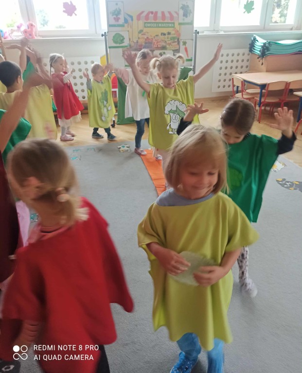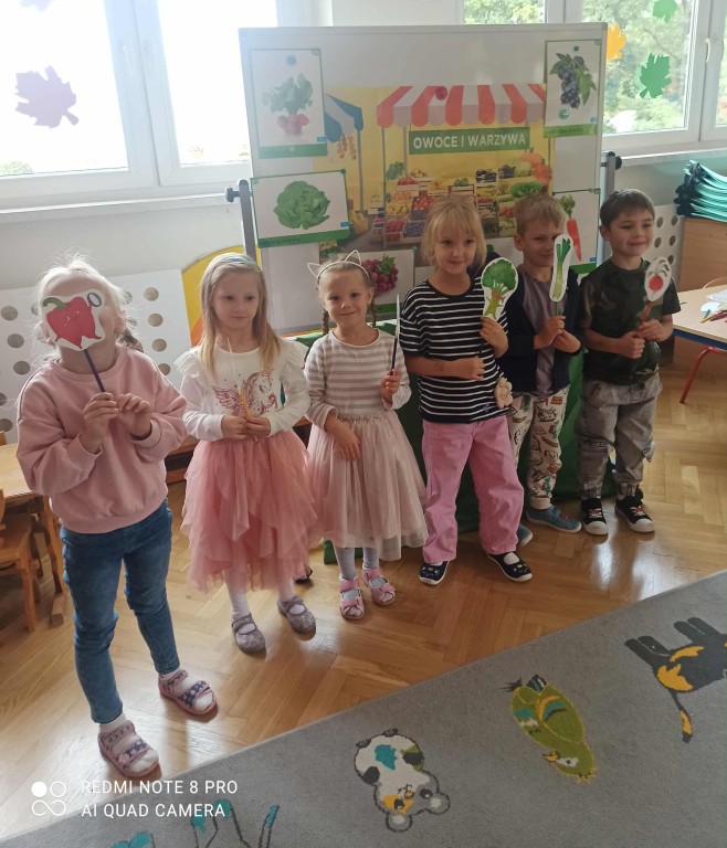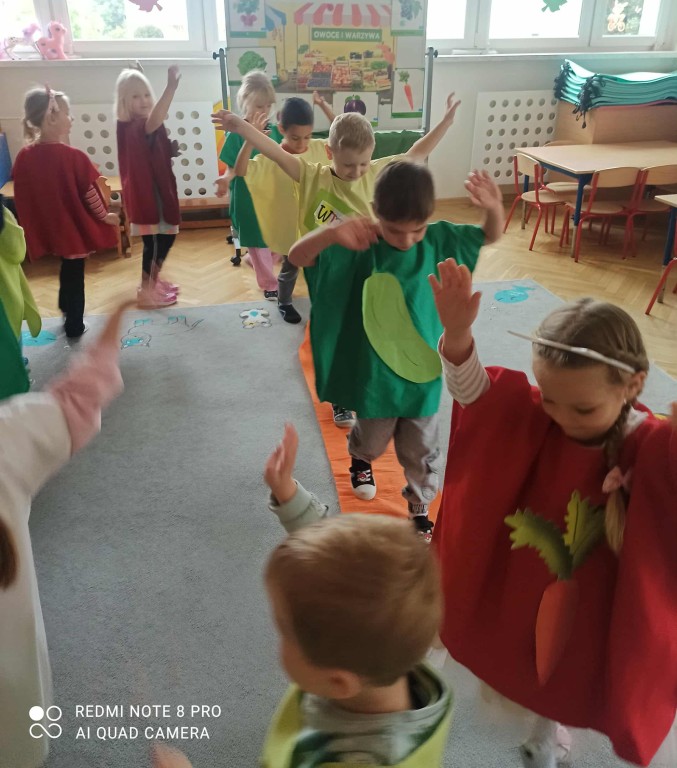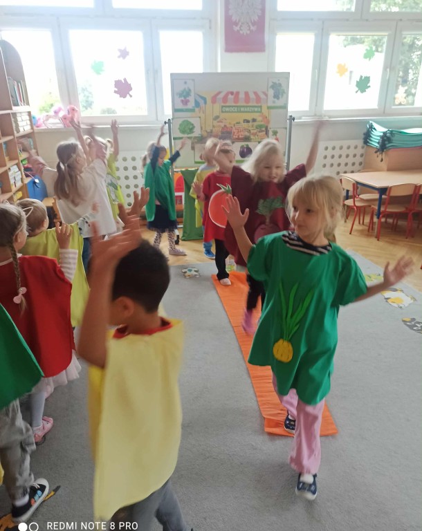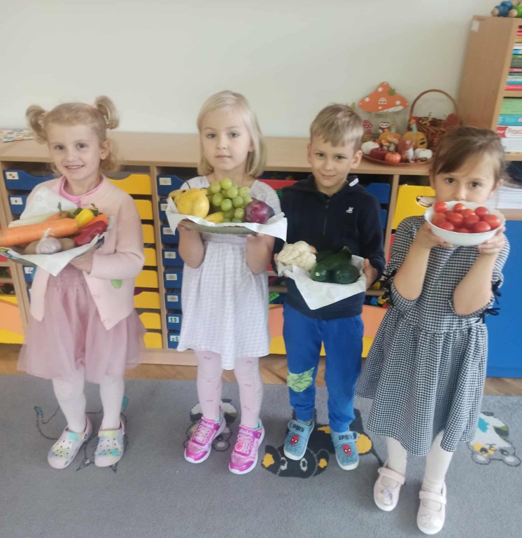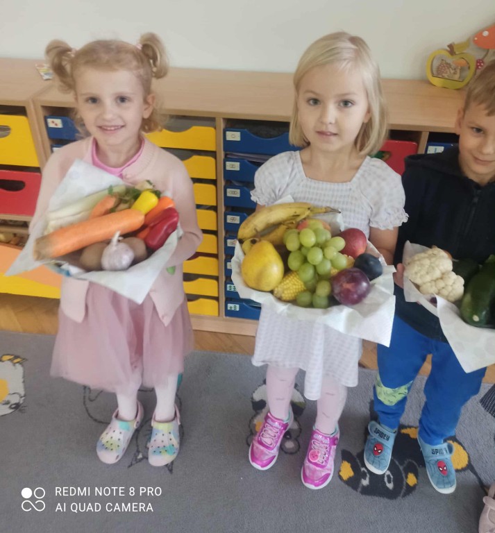 W ubiegłym tygodniu dzieci z grupy Zuchy wyruszyły w pełną i kolorową podróż po świecie warzyw i owoców. Dzieci poznały jak ważne są one w codziennej diecie. Podczas zajęć bawiliśmy się przy owocowych piosenkach, tańczyliśmy, śpiewaliśmy. Zorganizowaliśmy także warzywny pokaz mody. Wybraliśmy się do pobliskiego warzywaniaka, gdzie dzieci mogły z bliska obejrzeć i nazwać owoce i warzywa, a także samodzielnie wybrać produkty do naszego warzywno - owocowego kącika. Nie zabrakło też gier i zabaw dydaktycznych, dzięki którym Zuchy utrwalały swoją wiedzę o zdrowym odżywianiu, jedną z atrakcji był także mini teatrzyk pt. ,,Nowinki z warzywaniaka Witaminki". Na zakończenie tygodnia dzieci wykonały pracę plastyczną przedstawiającą soczyste jabłka. To był tydzień pełen uśmechu i dobrej zabawy, prawdziwa witaminowa przygoda Zuchów!