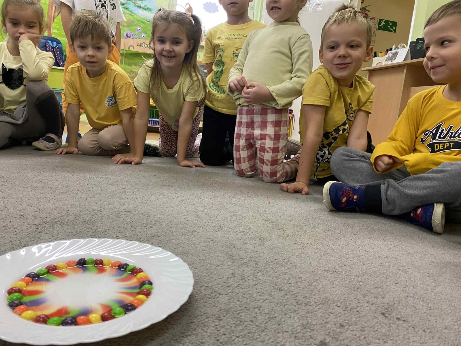 W minionym tygodniu grupa „Słoneczka” świętowała Dzień Edukacji Narodowej w wyjątkowy, kolorowy sposób. Każdy dzień upłynął pod znakiem innego koloru, a przedszkolaki uczestniczyły w różnorodnych zabawach, zajęciach dydaktycznych, ruchowych i plastycznych związanych z barwą dnia. Poniedziałek był dniem czerwonym - dzieci ubrały się w czerwone ubrania, poznawały przedmioty i owoce w tym kolorze. We wtorek królował kolor niebieski, który wprowadził spokój i radość. „Słoneczka” poznały rzeczy związane z wodą i niebem, a w kąciku kolorów pojawiły się przyniesione z domu niebieskie przedmioty. W tym dniu dzieci z grupy „Słoneczka” zaprezentowały także inscenizację z okazji Dnia Edukacji Narodowej. Środa natomiast upłynęła w barwach pomarańczowych - dzieci poznawały jesienne owoce i warzywa, takie jak dynie i marchewki, oraz tworzyły pomarańczowe ozdoby. Czwartek był dniem zielonym, pełnym energii i przyrody. Piątek natomiast zakończył tydzień kolorem żółtym, symbolem słońca i radości. W tym dniu w sali panował ciepły, pogodny nastrój. Dodatkowo dzieci wspólnie wykonały kolorowy eksperyment z cukierkami i wodą, tworząc przepiękną tęczę - to była prawdziwa magia kolorów. Ten tydzień był pełen uśmiechów, zabawy i nauki poprzez doświadczanie.
