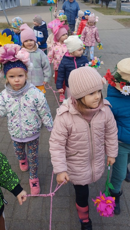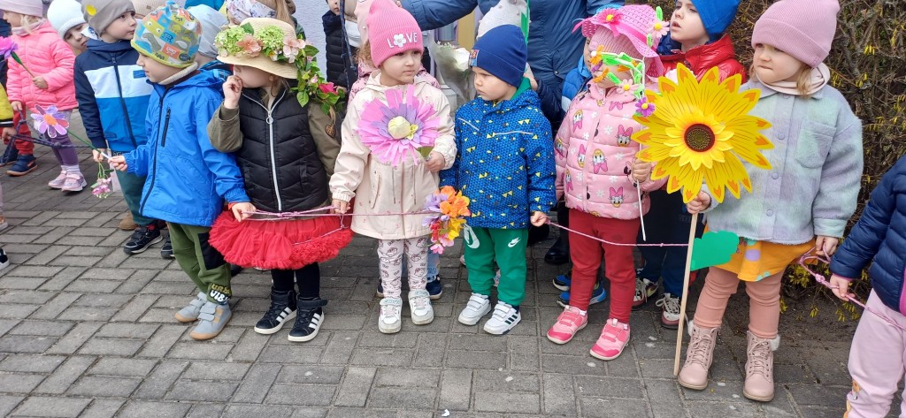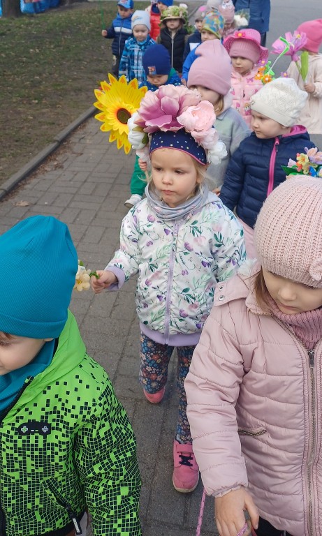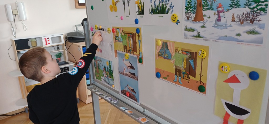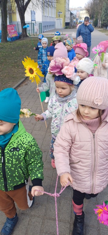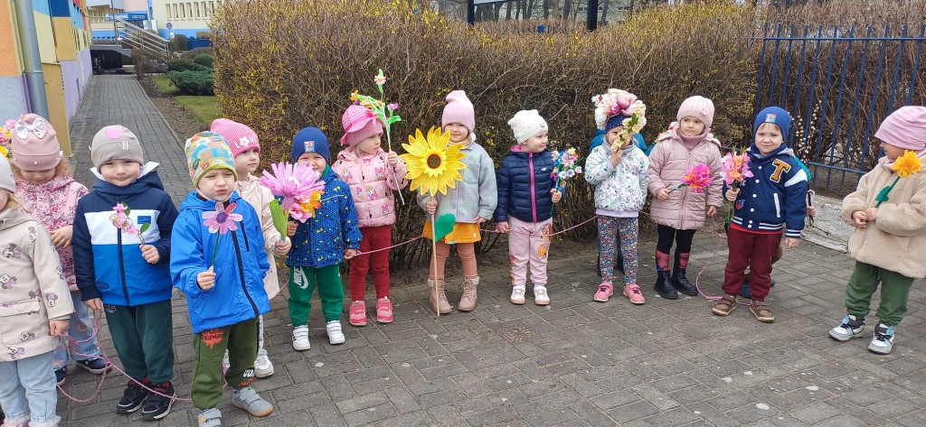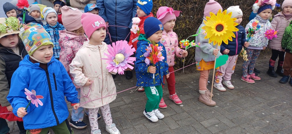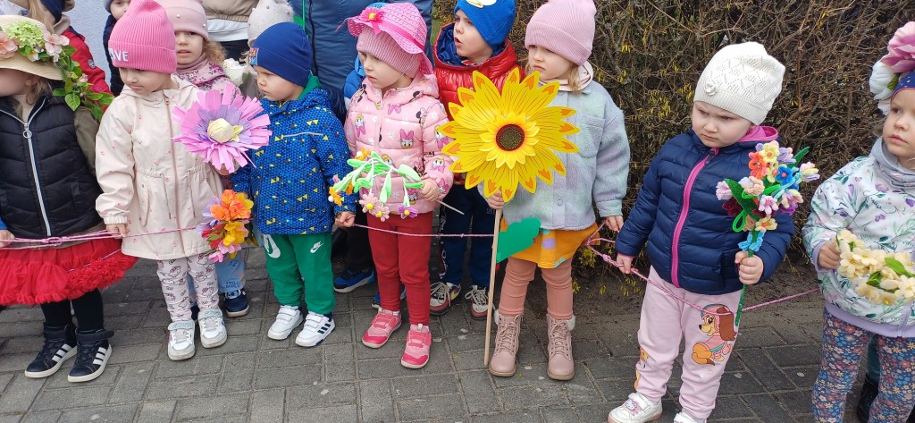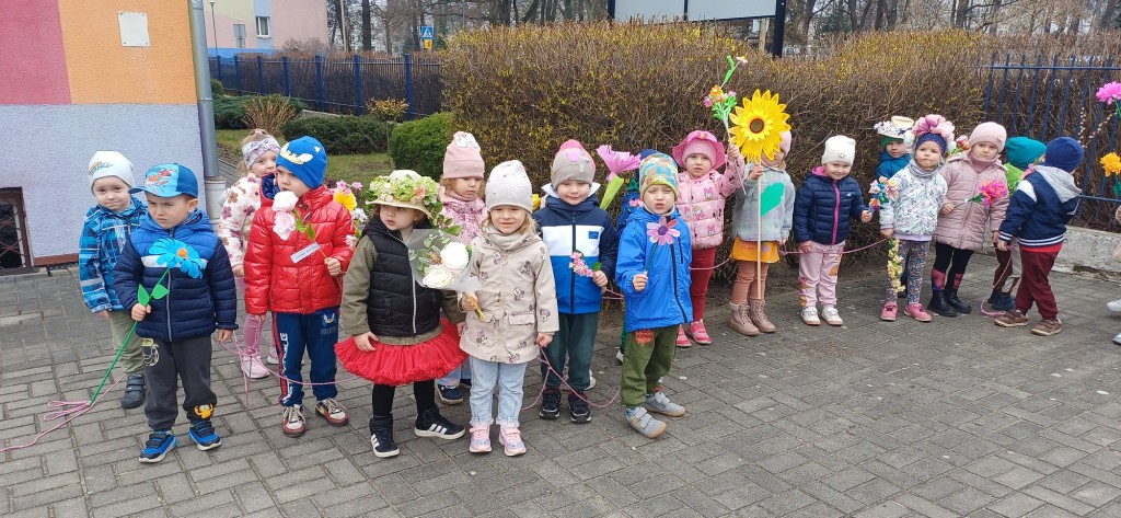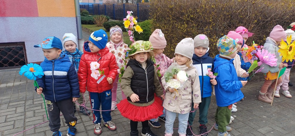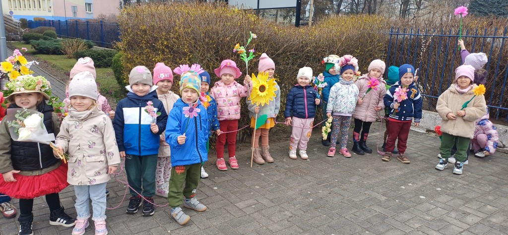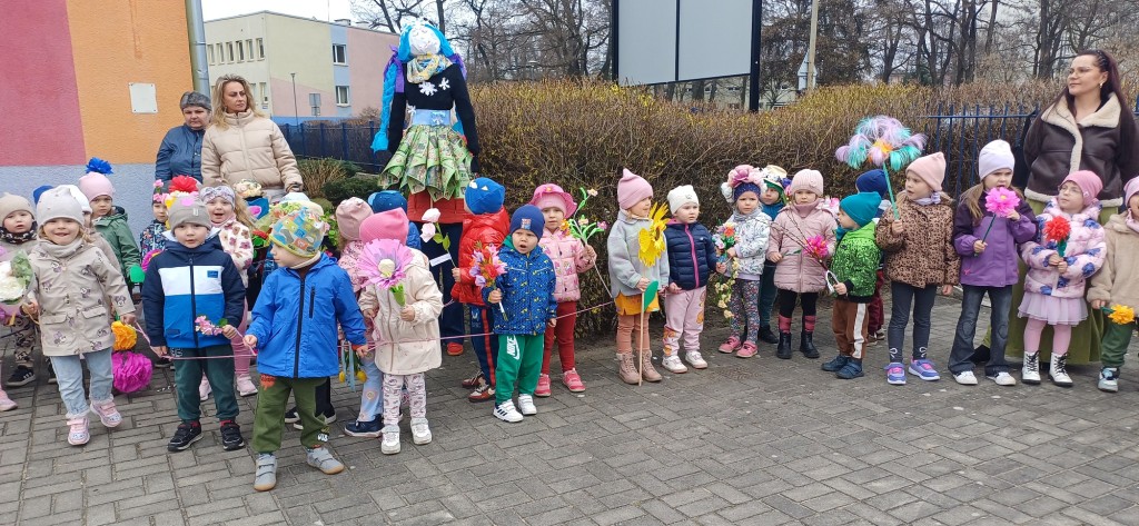 Dzieci z grupy „Smerfy” poznały zwiastuny wiosny oraz wykonały prace plastyczne „Kolorowy tulipan” i „Bocian”. Brały udział w zabawie muzyczno-ruchowej związanej z bocianem. Podczas zajęć rozwijających kompetencje emocjonalno-społeczne rozwiązywały zadania, ćwicząc percepcję wzrokową oraz spostrzegawczość. Przedszkolaki wzięły również udział w powitaniu wiosny – maszerowały ze swoimi kwiatami podczas wiosennego spaceru oraz uczestniczyły w tradycyjnym paleniu Marzanny.