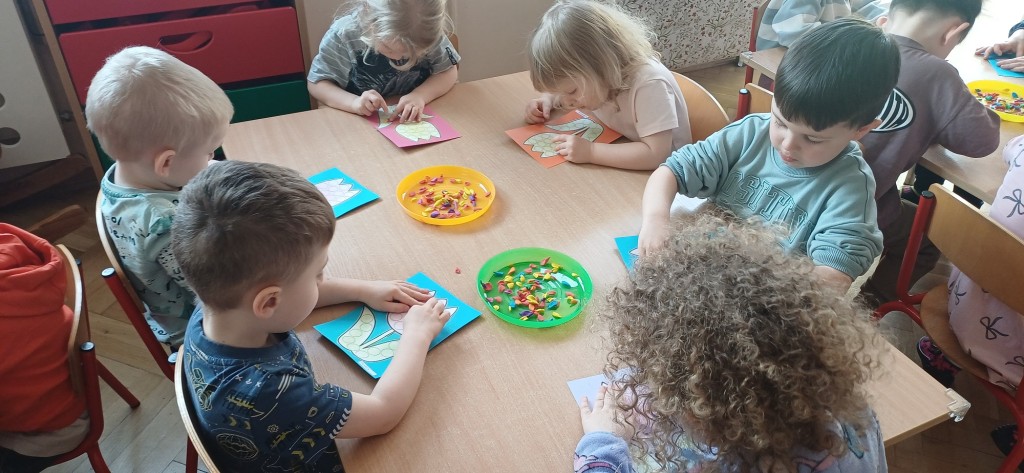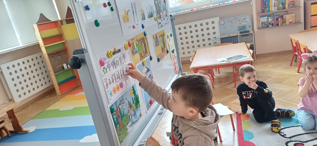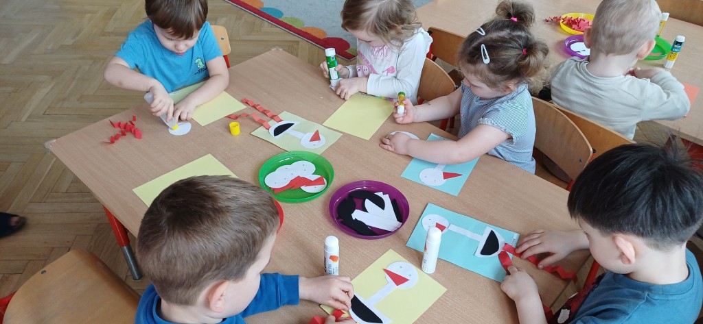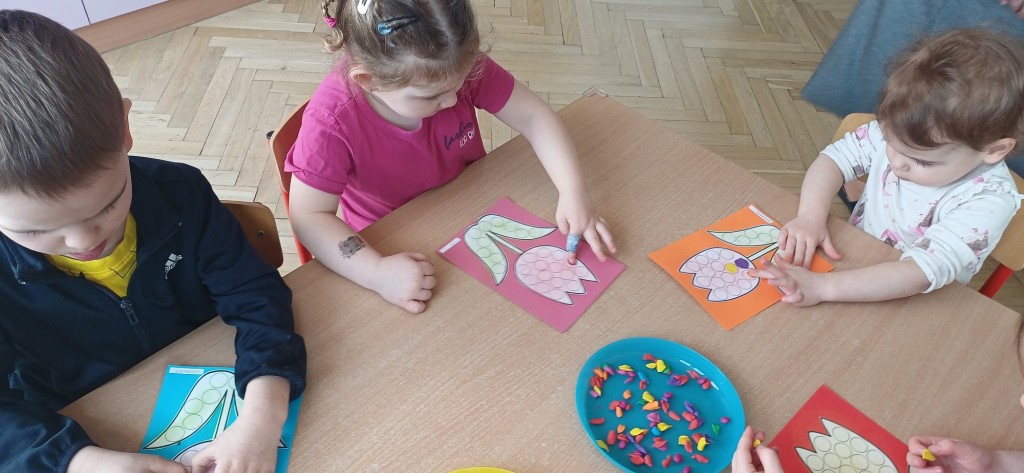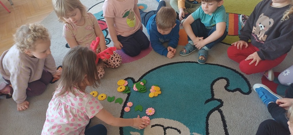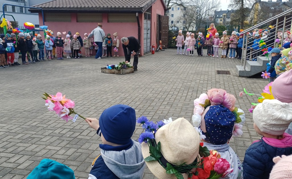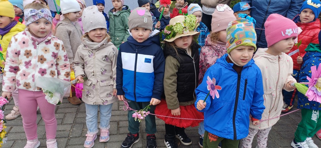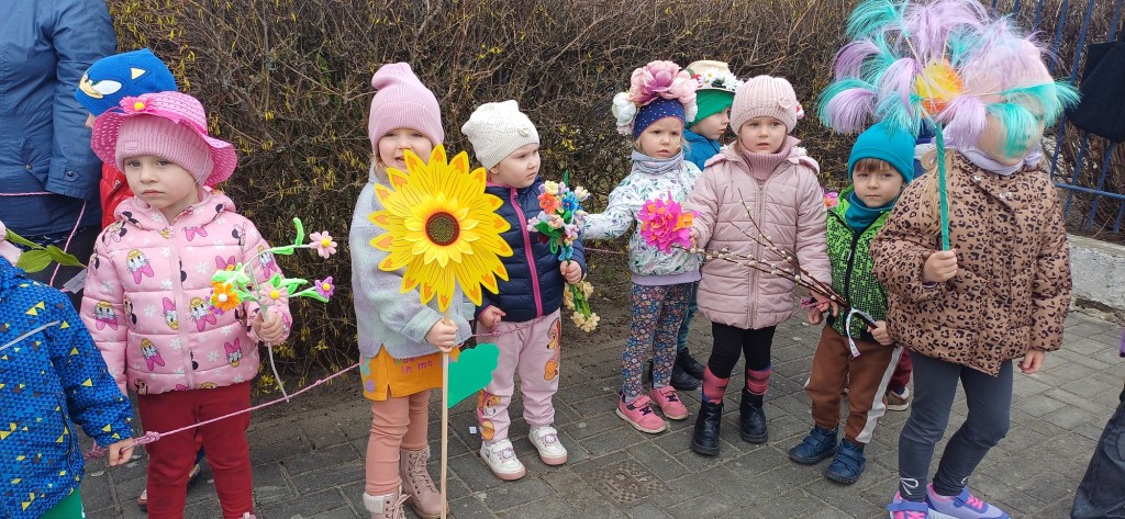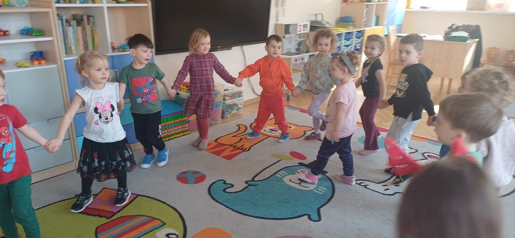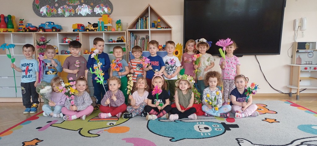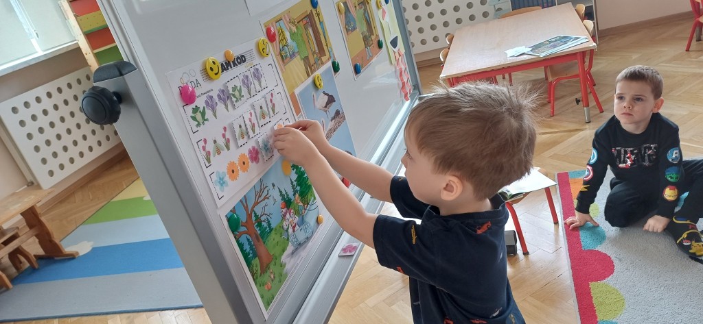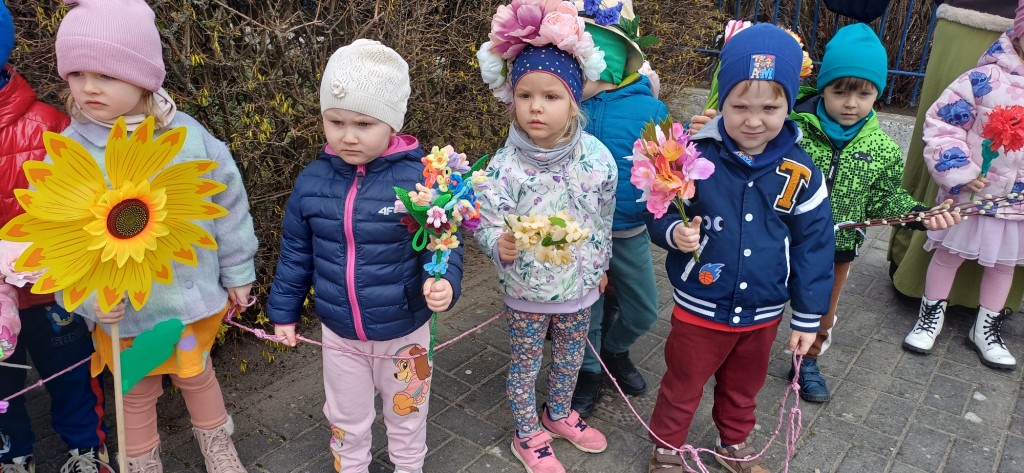 Dzieci z grupy „Smerfy” poznały zwiastuny wiosny oraz wykonały prace plastyczne „Kolorowy tulipan” i „Bocian”. Brały udział w zabawie muzyczno-ruchowej związanej z bocianem. Podczas zajęć rozwijających kompetencje emocjonalno-społeczne rozwiązywały zadania, ćwicząc percepcję wzrokową oraz spostrzegawczość. Przedszkolaki wzięły również udział w powitaniu wiosny – maszerowały ze swoimi kwiatami podczas wiosennego spaceru oraz uczestniczyły w tradycyjnym paleniu Marzanny.
