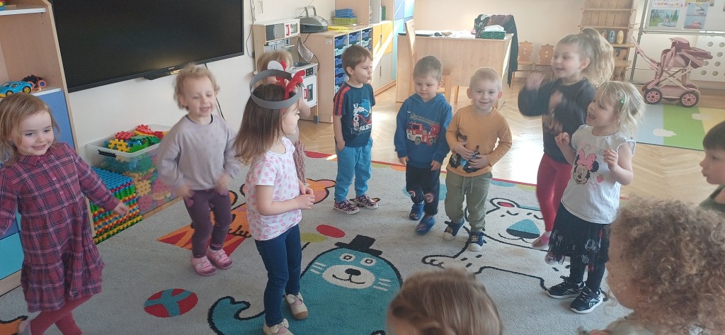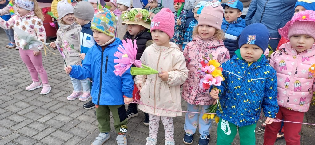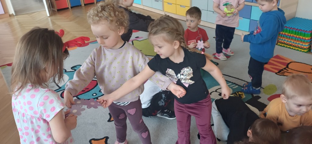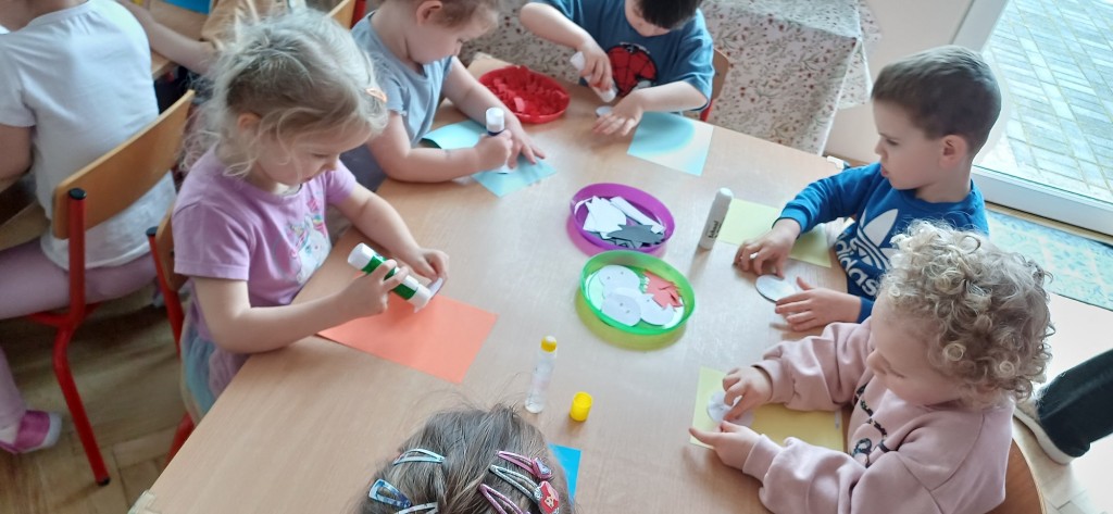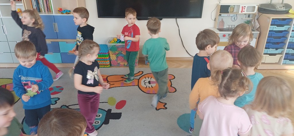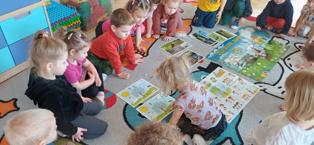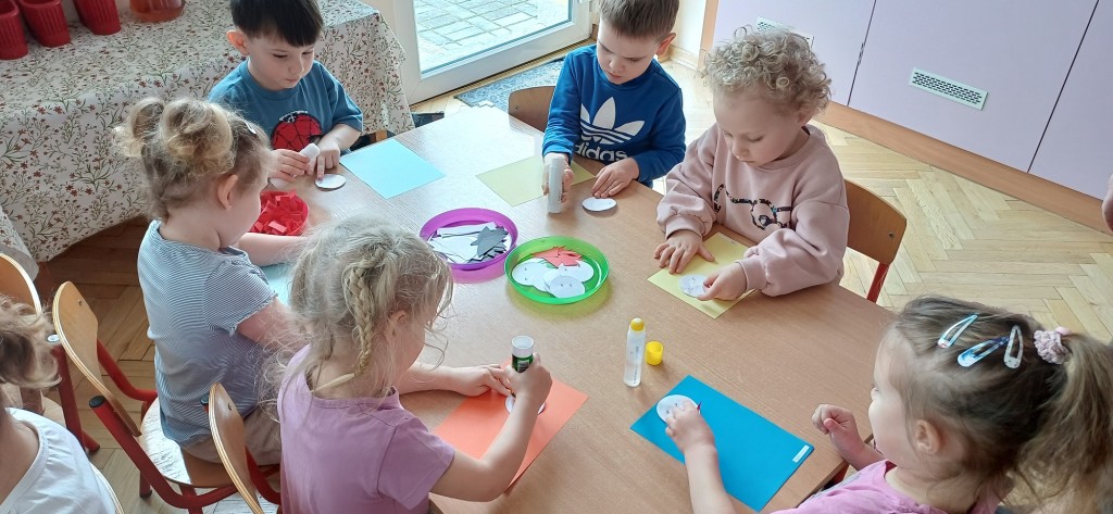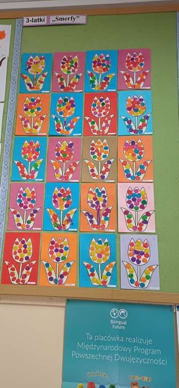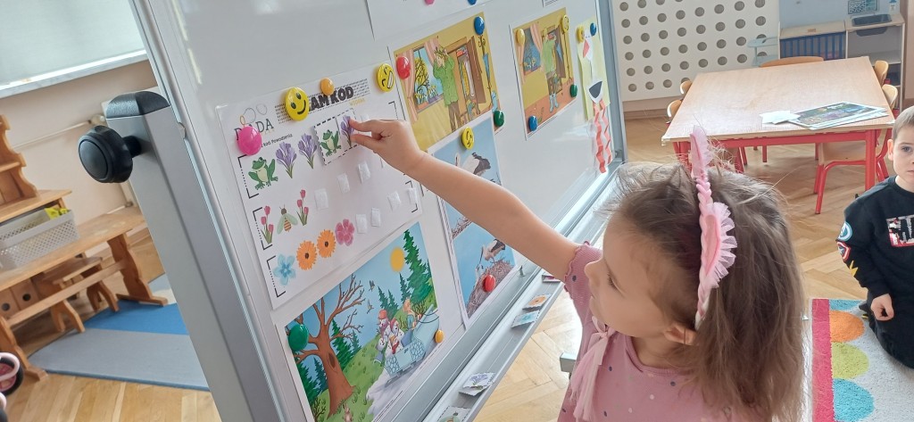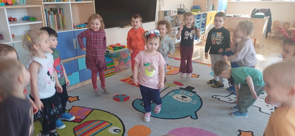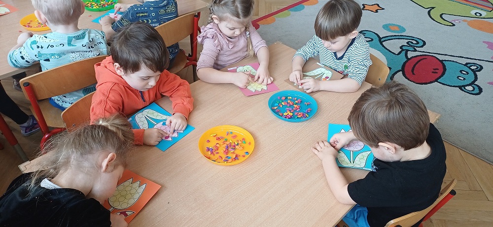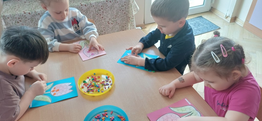 Dzieci z grupy „Smerfy” poznały zwiastuny wiosny oraz wykonały prace plastyczne „Kolorowy tulipan” i „Bocian”. Brały udział w zabawie muzyczno-ruchowej związanej z bocianem. Podczas zajęć rozwijających kompetencje emocjonalno-społeczne rozwiązywały zadania, ćwicząc percepcję wzrokową oraz spostrzegawczość. Przedszkolaki wzięły również udział w powitaniu wiosny – maszerowały ze swoimi kwiatami podczas wiosennego spaceru oraz uczestniczyły w tradycyjnym paleniu Marzanny.