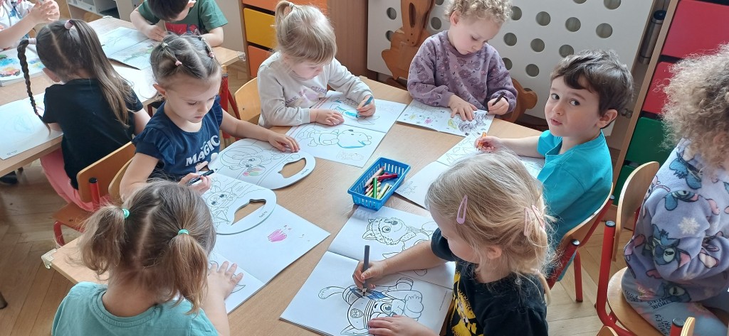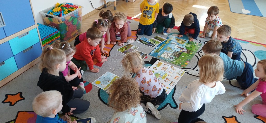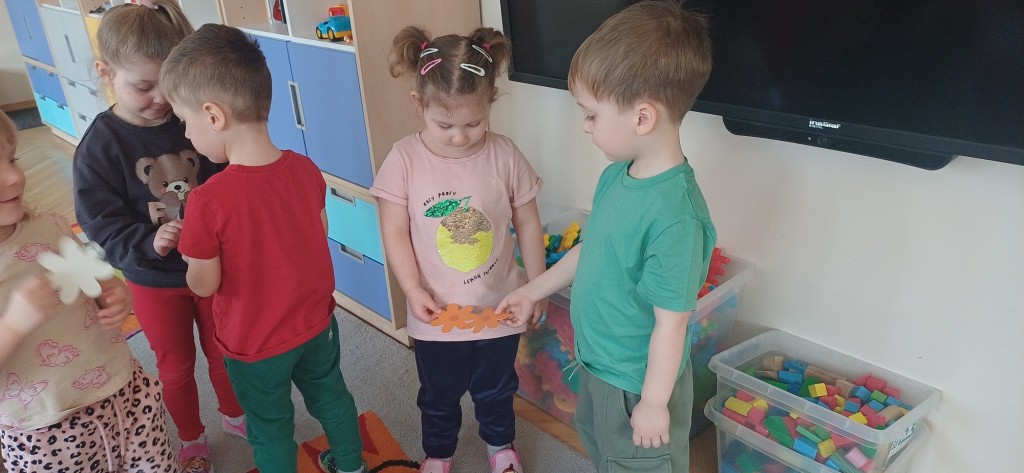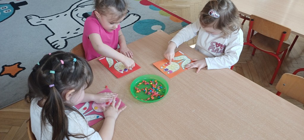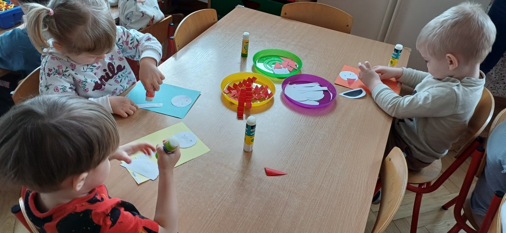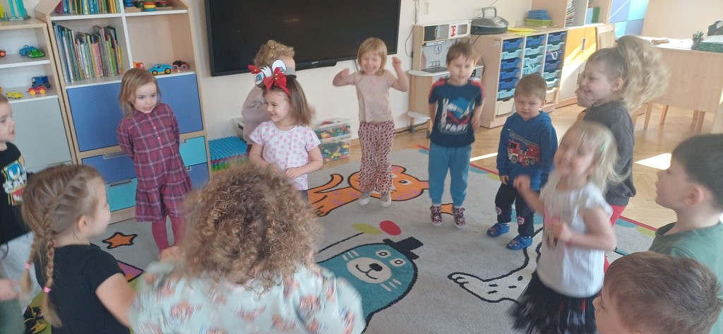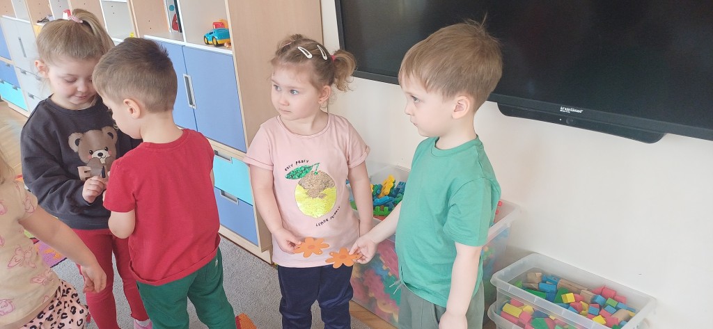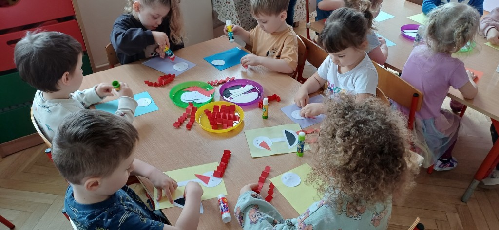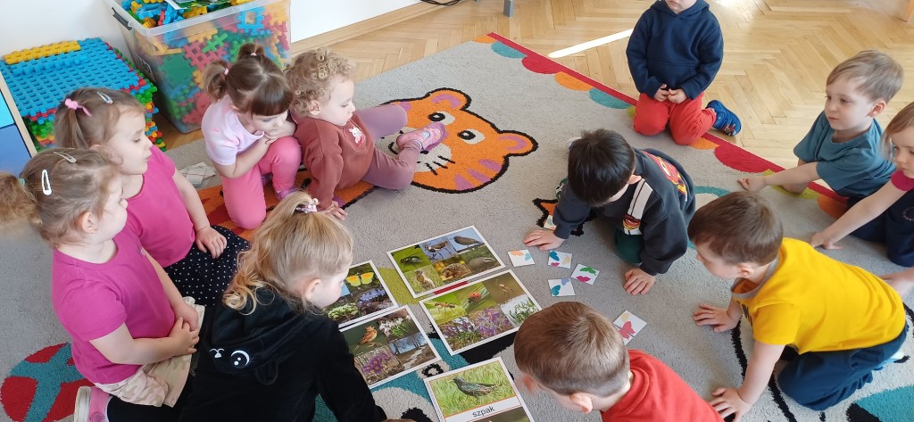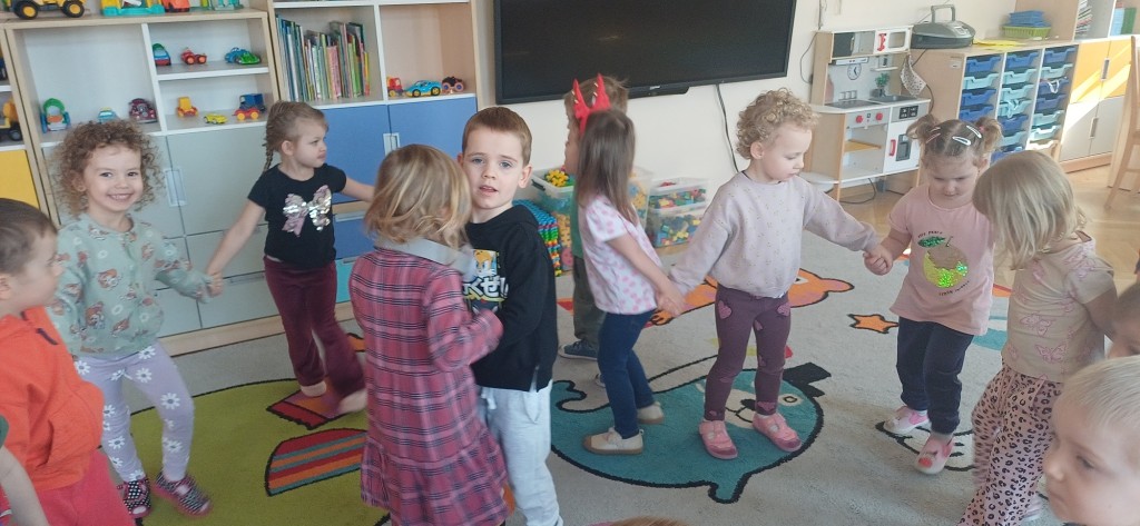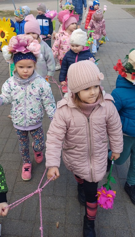 Dzieci z grupy „Smerfy” poznały zwiastuny wiosny oraz wykonały prace plastyczne „Kolorowy tulipan” i „Bocian”. Brały udział w zabawie muzyczno-ruchowej związanej z bocianem. Podczas zajęć rozwijających kompetencje emocjonalno-społeczne rozwiązywały zadania, ćwicząc percepcję wzrokową oraz spostrzegawczość. Przedszkolaki wzięły również udział w powitaniu wiosny – maszerowały ze swoimi kwiatami podczas wiosennego spaceru oraz uczestniczyły w tradycyjnym paleniu Marzanny.