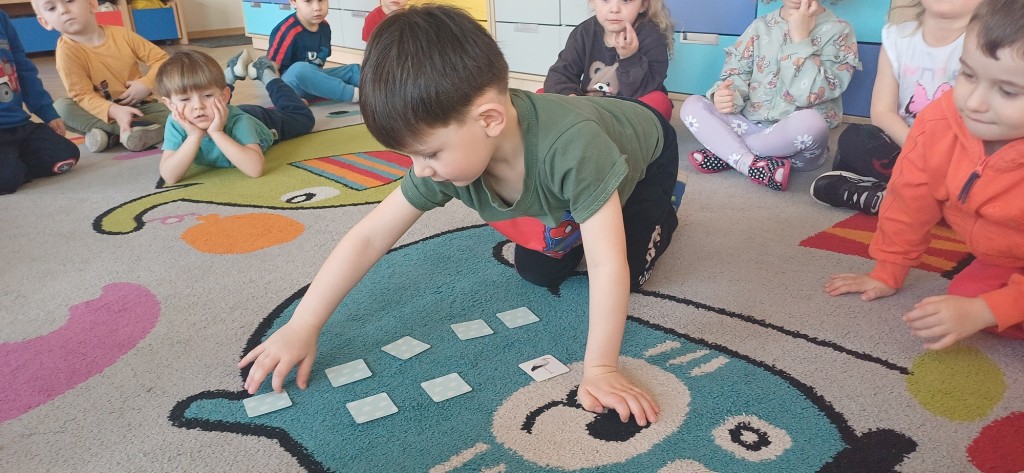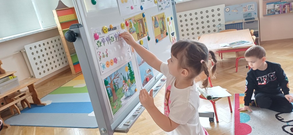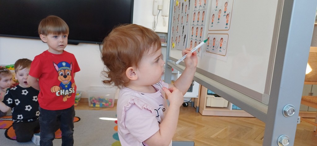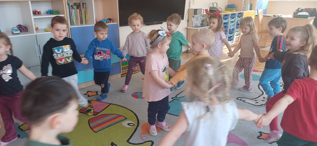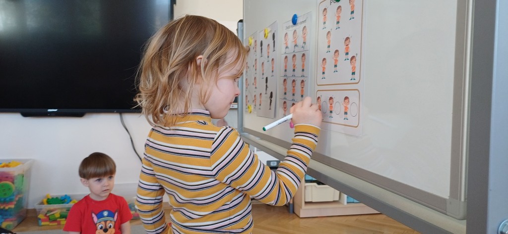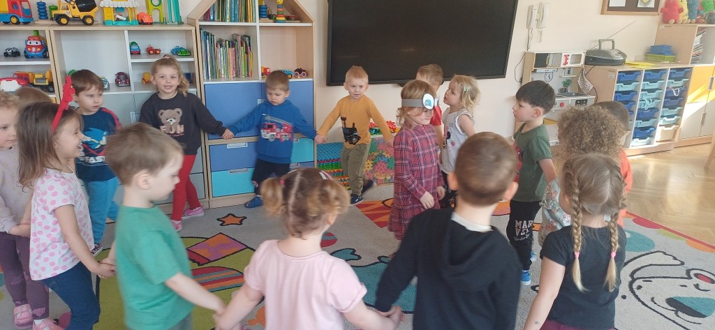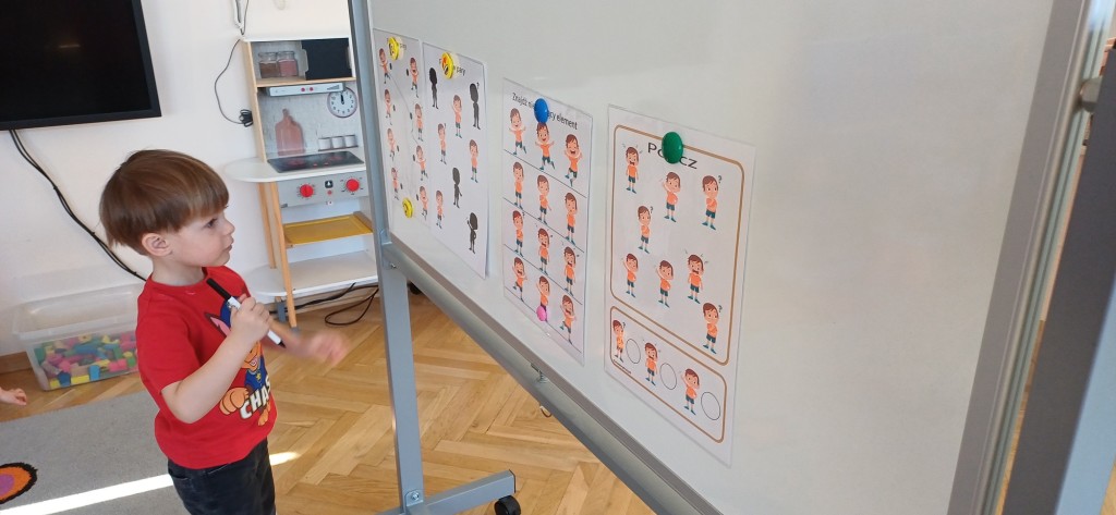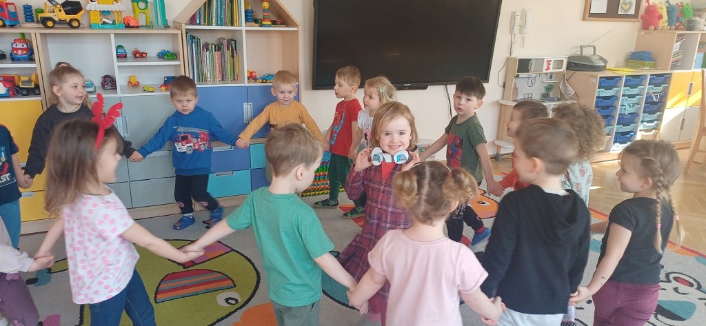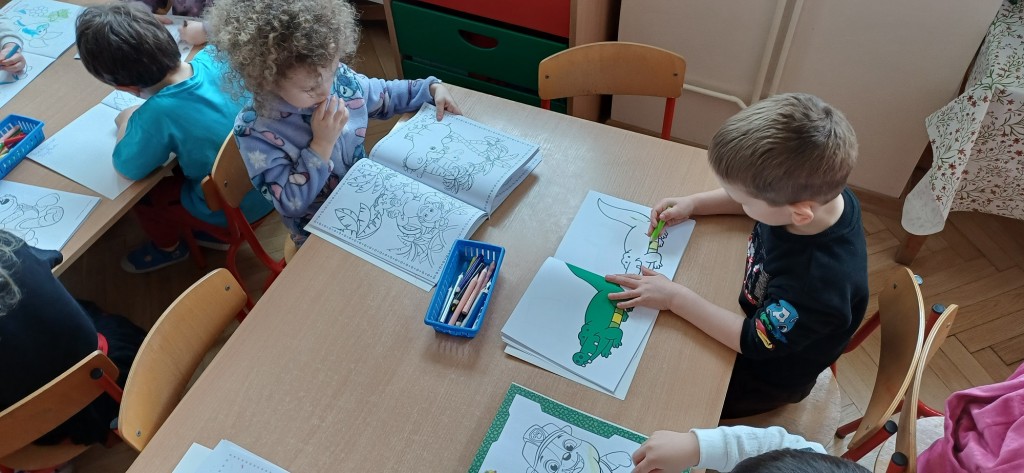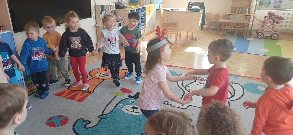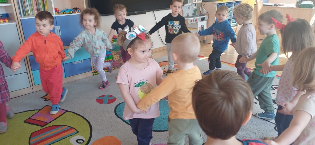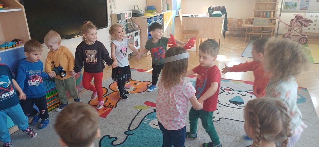 Dzieci z grupy „Smerfy” poznały zwiastuny wiosny oraz wykonały prace plastyczne „Kolorowy tulipan” i „Bocian”. Brały udział w zabawie muzyczno-ruchowej związanej z bocianem. Podczas zajęć rozwijających kompetencje emocjonalno-społeczne rozwiązywały zadania, ćwicząc percepcję wzrokową oraz spostrzegawczość. Przedszkolaki wzięły również udział w powitaniu wiosny – maszerowały ze swoimi kwiatami podczas wiosennego spaceru oraz uczestniczyły w tradycyjnym paleniu Marzanny.