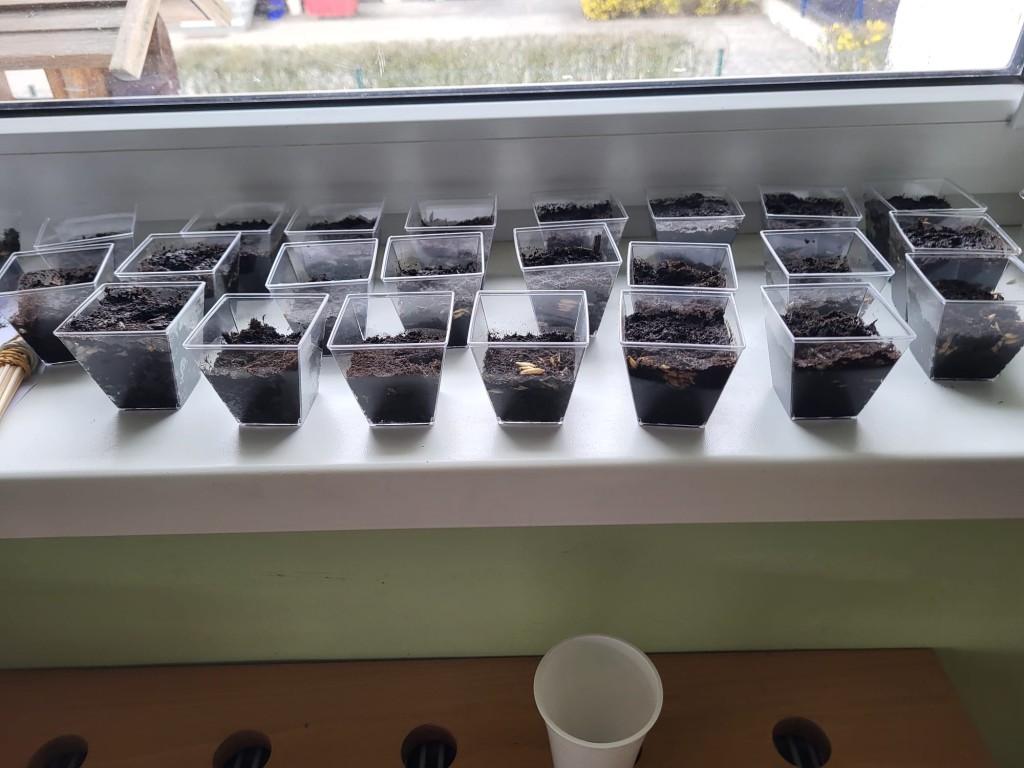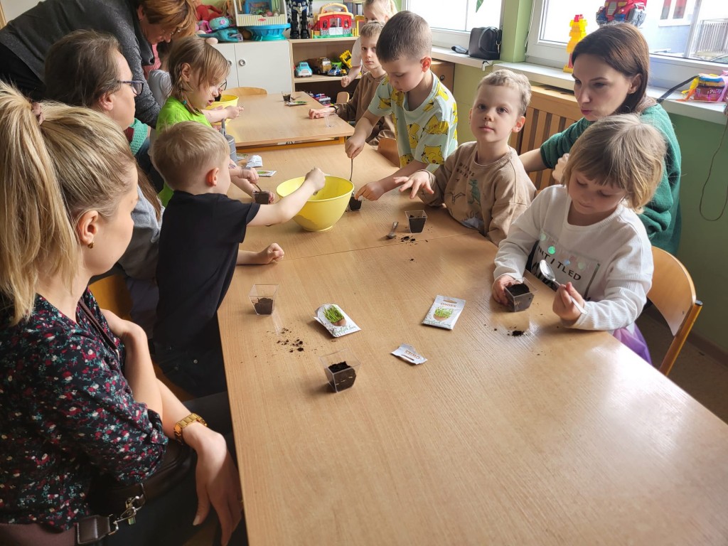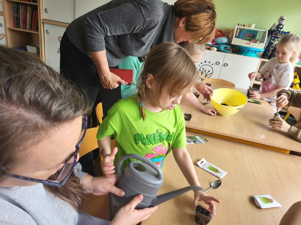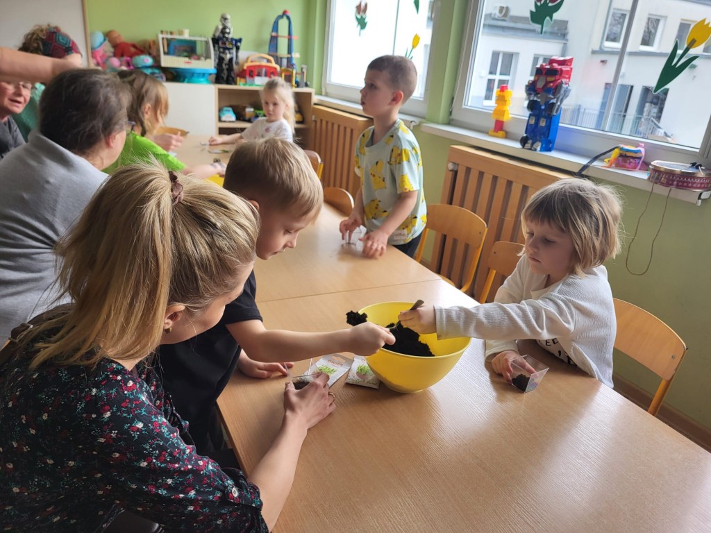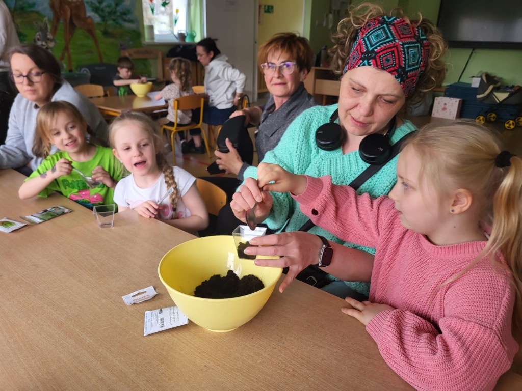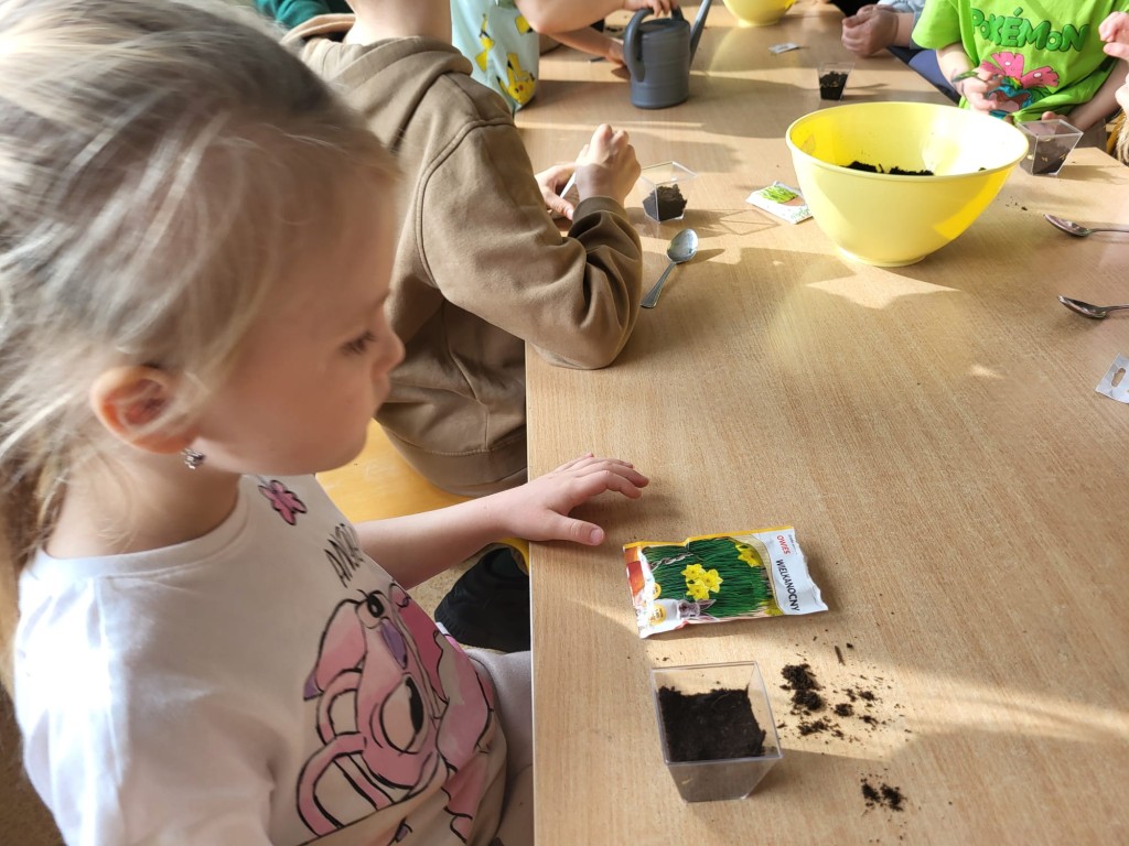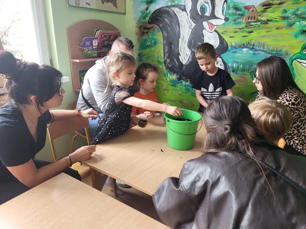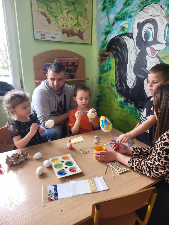 26 marca w grupie Słoneczek odbyły się Warsztaty Wielkanocne z udziałem dzieci oraz ich rodziców. Spotkanie miało na celu wspólne przygotowanie się do Świąt Wielkanocnych, integrację rodzin oraz rozwijanie kreatywności dzieci. Pierwszym zadaniem było sianie owsa do przygotowanych wcześniej pojemników. Dzieci z dużym zaangażowaniem wsypywały ziemię, wysiewały nasiona oraz podlewały swoje roślinki. Była to nie tylko świetna zabawa, ale także okazja do nauki odpowiedzialności i obserwacji wzrostu roślin. Kolejnym etapem było zdobienie jajek. Dzieci wraz z rodzicami wykorzystywały różnorodne materiały plastyczne, takie jak farby, naklejki, kolorowy brokat oraz pisaki. Powstały piękne, kolorowe pisanki, które odzwierciedlały pomysłowość i indywidualny styl każdego uczestnika. Warsztaty przebiegały w miłej i radosnej atmosferze. Wspólne działania sprzyjały budowaniu relacji między dziećmi, rodzicami oraz nauczycielkami. Spotkanie było również doskonałą okazją do spędzenia czasu w twórczy i wartościowy sposób.